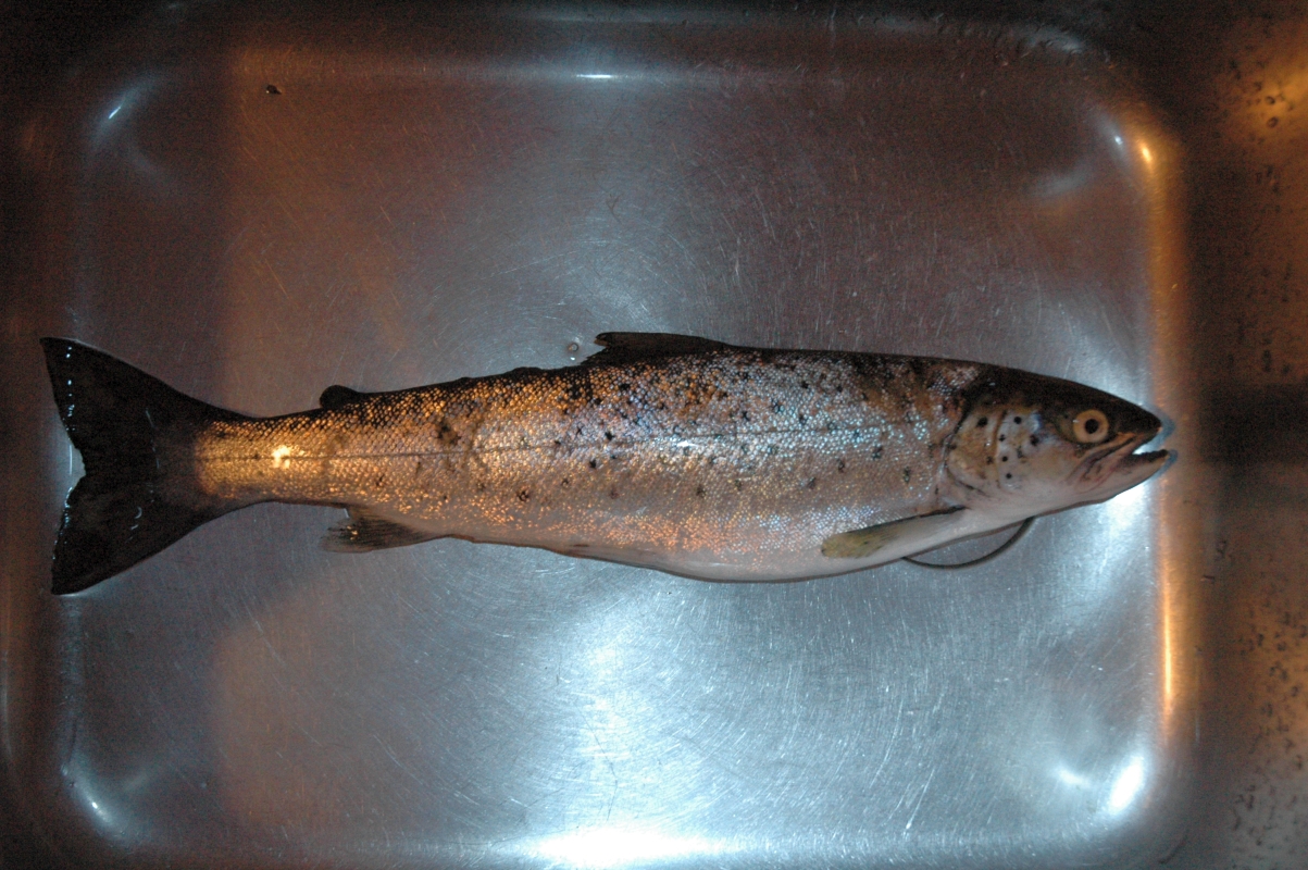 Ab Vertonodden schleppten wir wieder, und dann die Sensation! Ungefähr auf Höhe von Rorvikstrand hatte der Große wieder einen Biss. Als der Fisch in Sichtweite kam erkannte wir, dass es sich nicht um die allgegenwärtigen Köhler handelte sondern eine Meerforelle war! Gefangen auf einen 18gr Kupferfarbenen Toby-Blinker. Geil! Die Freude im Boot war riesig! Eine schöne Portionsforelle! Beim Ausnehmen zeigte sich, dass sie vollgefressen mit Flöhen war!