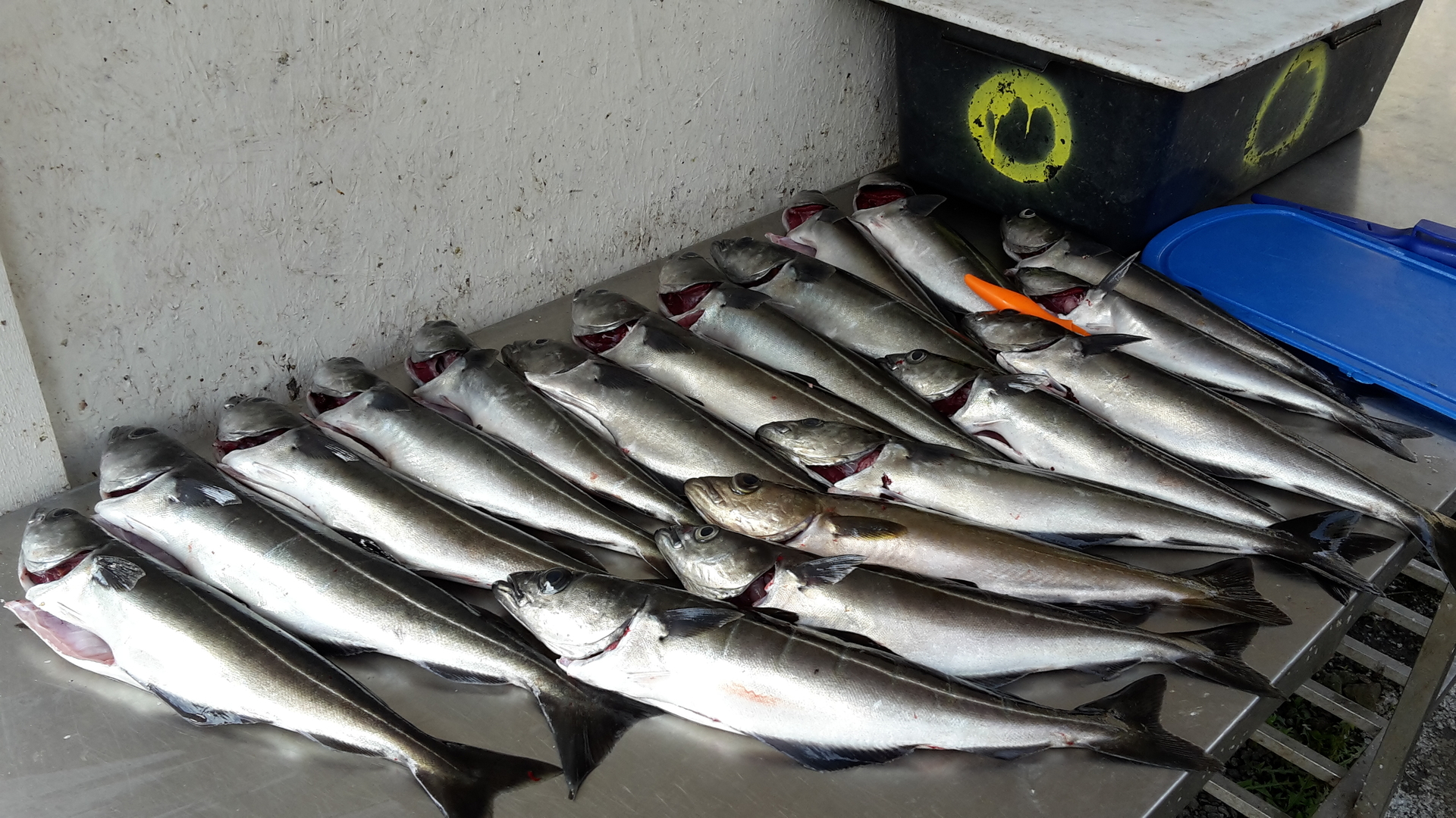 Donnerstag, wieder 4 Uhr, alle fit und ab aufs Wasser. Heute mehr Welle und auch stärkere Drift. Selbst 280 Gr. waren nur sehr schwer am Grund zu halten und wir mussten nach mehreren Driften ohne Fisch einsehen das es wenig bringen würden hier so weiter zu machen. Wir wollten es auf den Lamekletten versuchen und auf dem Weg dorthin überfuhren wir einige Köhlerschwärme von von auch einige an die Haken gingen. Und damit die Laune auch merklich steigen ließen. Dann konnte Papa einen 65 cm Dorsch bei einem Piercingwunsch behilflich sein, wir fanden das aber nicht so schick weshalb alle 3 Spitzen vom Drilling aus dem Kopf wieder entfernt worden sind. Aber es sollte noch besser kommen für unsere beiden Neulinge. Auf dem Torsholmgrunnen fanden wir wieder einen riesigen Köhlerschwarm und es rappelte richtig mehrere male kamen 4 oder gar 5 Fische ins Boot und es wurde um die Wette gegrinst. Nach 2 Stunden waren die Fische auch fertig für die Küche und abends wurde reichlich Fisch aufgetischt und der Herrentag begossen.