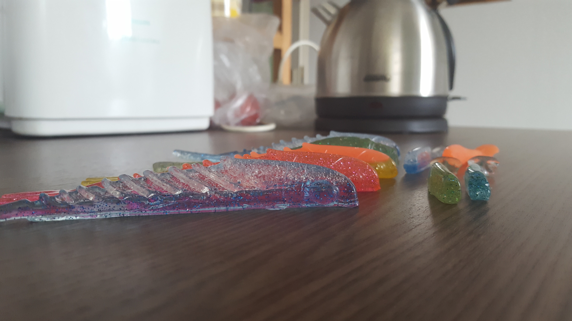 Ich will mir für den Platten eine Silikonform machen- zweiteilig. Damit hätte ich das Problem mit dem "nachschrumpfen" nicht. Bei den anderen habe ich einfach heißes Plastisol nachgegossen. Das Plastisol lässt sich dann auch noch sehr gut mit Hitze (Feuerzeug) in die gewünschte Richtung lenken.