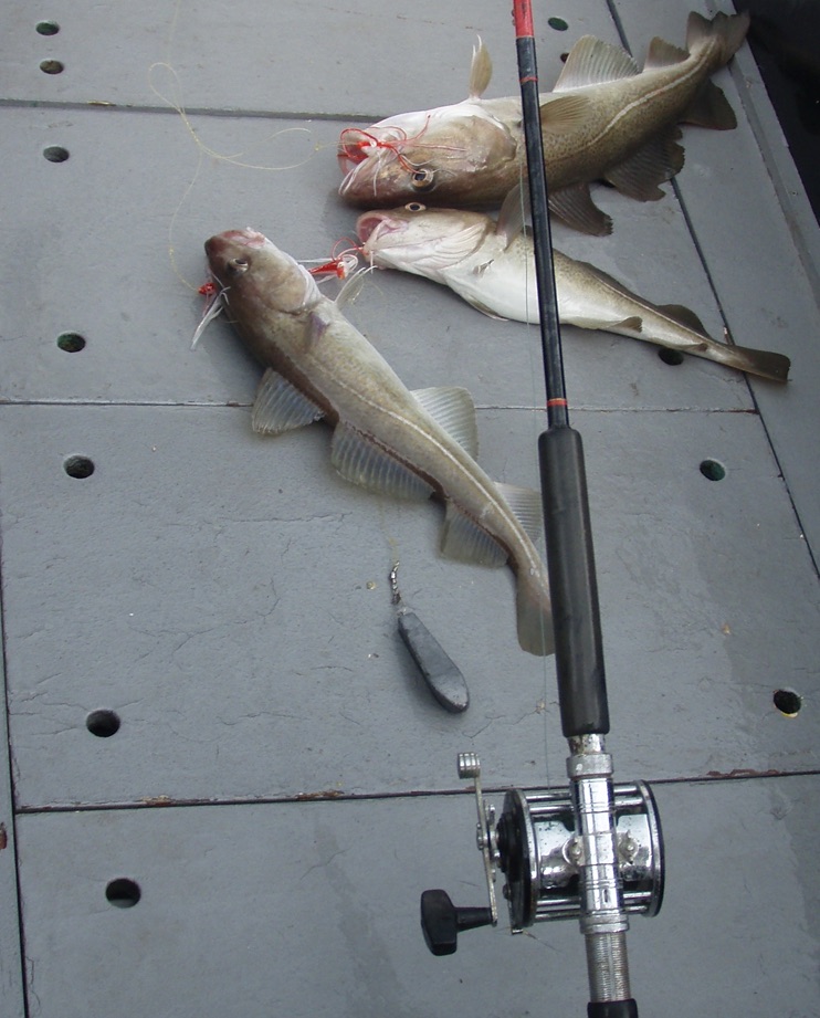 In diesem Fall ein billiges Dorsch- Paternoster aus 3 Haken mit Gummi- Oktopussen. Sollte man nur nehmen, wenn genug Fische da sind, sonst gibt es Hänger in den Wracks, die meist mit Fischernetzen überzogen sind.
