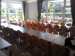 Wir haben einen schönen großen hellen Raum, wenn das Wetter gut ist, können wir die überdachte Terrasse auch nutzen.