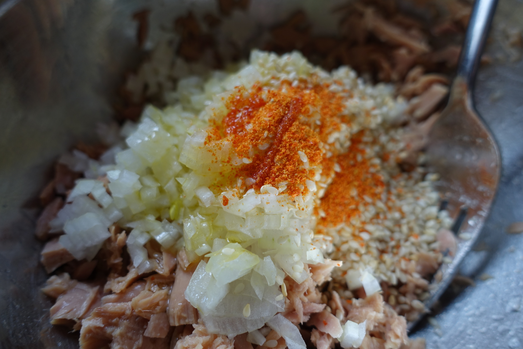 Für den Thunfischsalat den Thunfisch aus der Dose nehmen, abtropfen lassen. Abschmecken mit frischer Zwiebel fein gewürfelt, Chili, Sesam, Olivenöl und Salz.