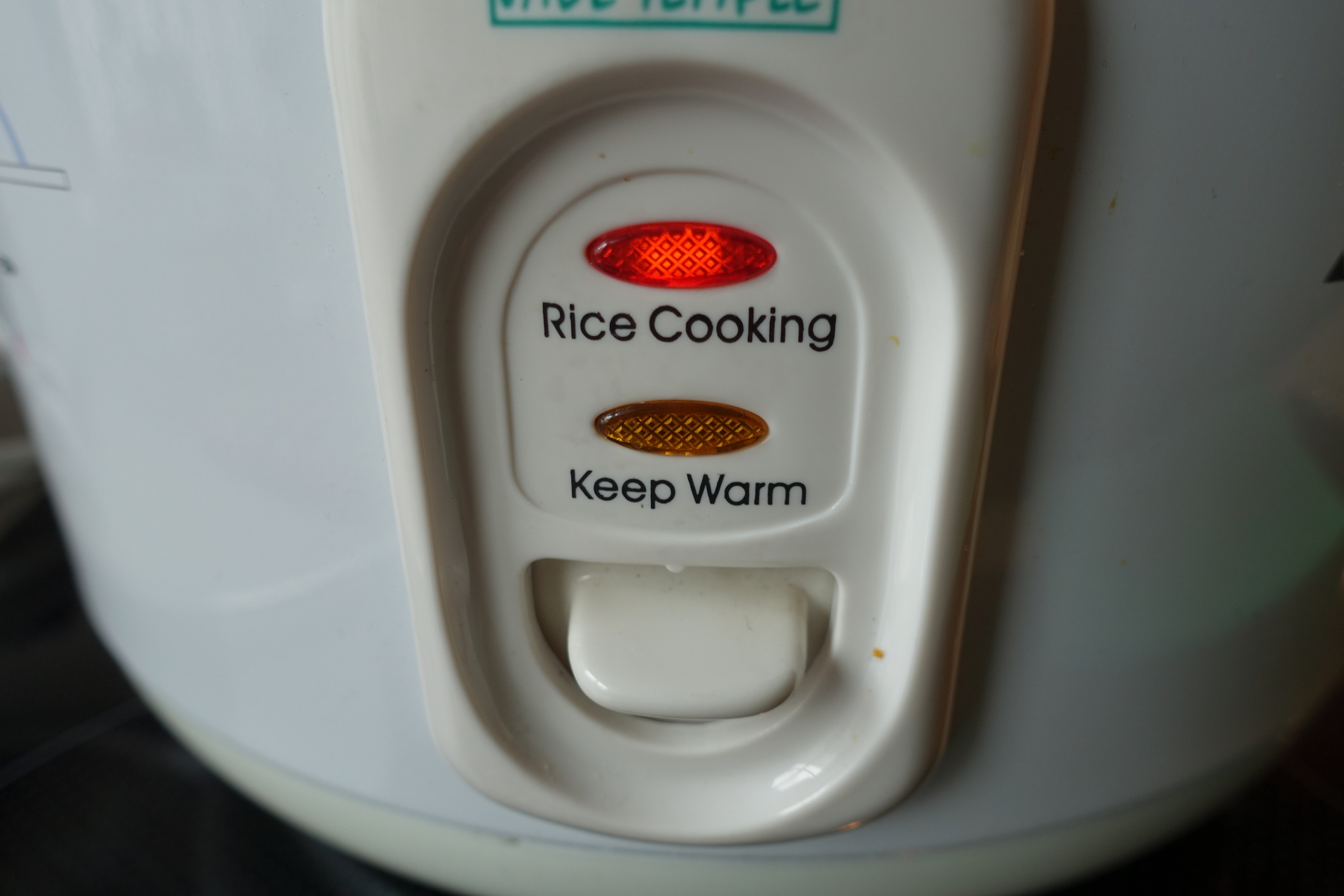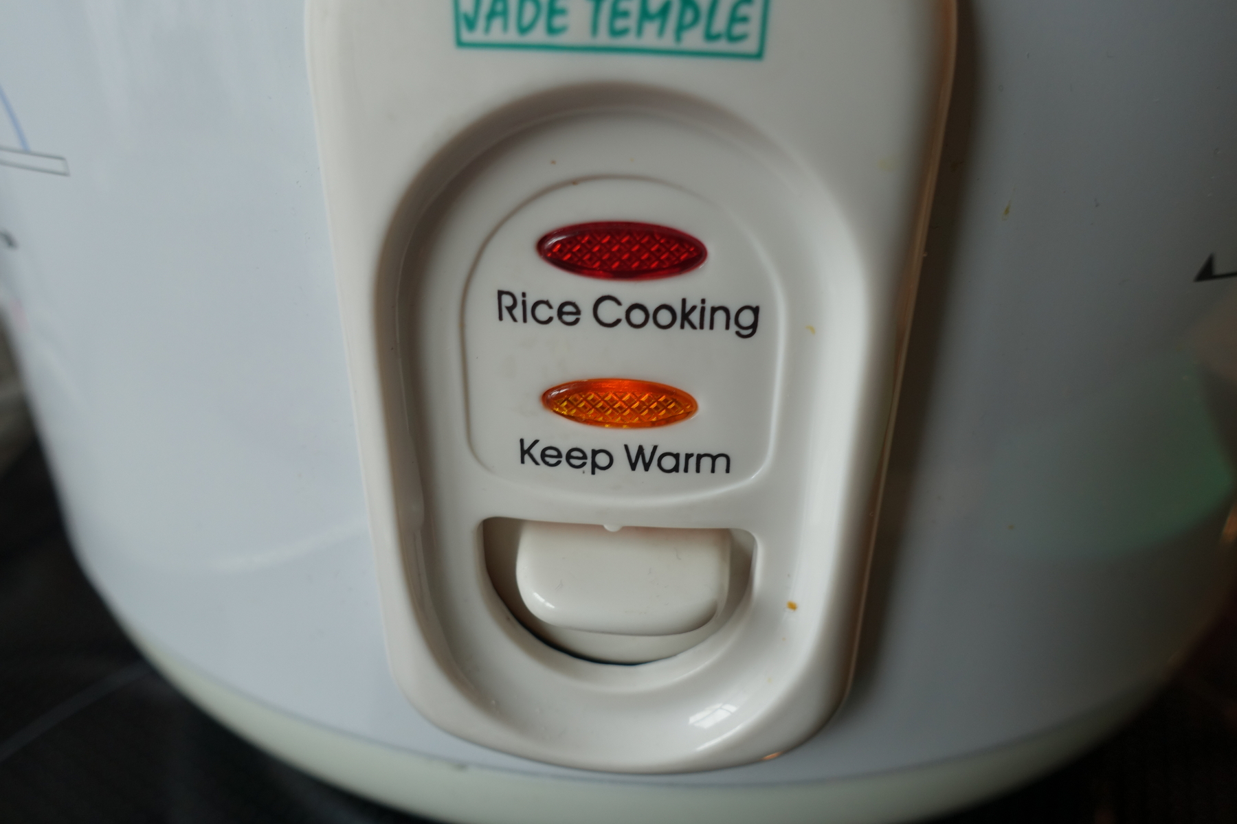 Den Reis kalt abspülen, in einen Reiskocher geben und mit dem kalten Wasser auffüllen. Schalter auf "Rice Cooking", nachdem der Kocher auf "Keep Warm" umgeschaltet hat, noch ca. 5 Minuten ungeöffnet ziehen lassen.