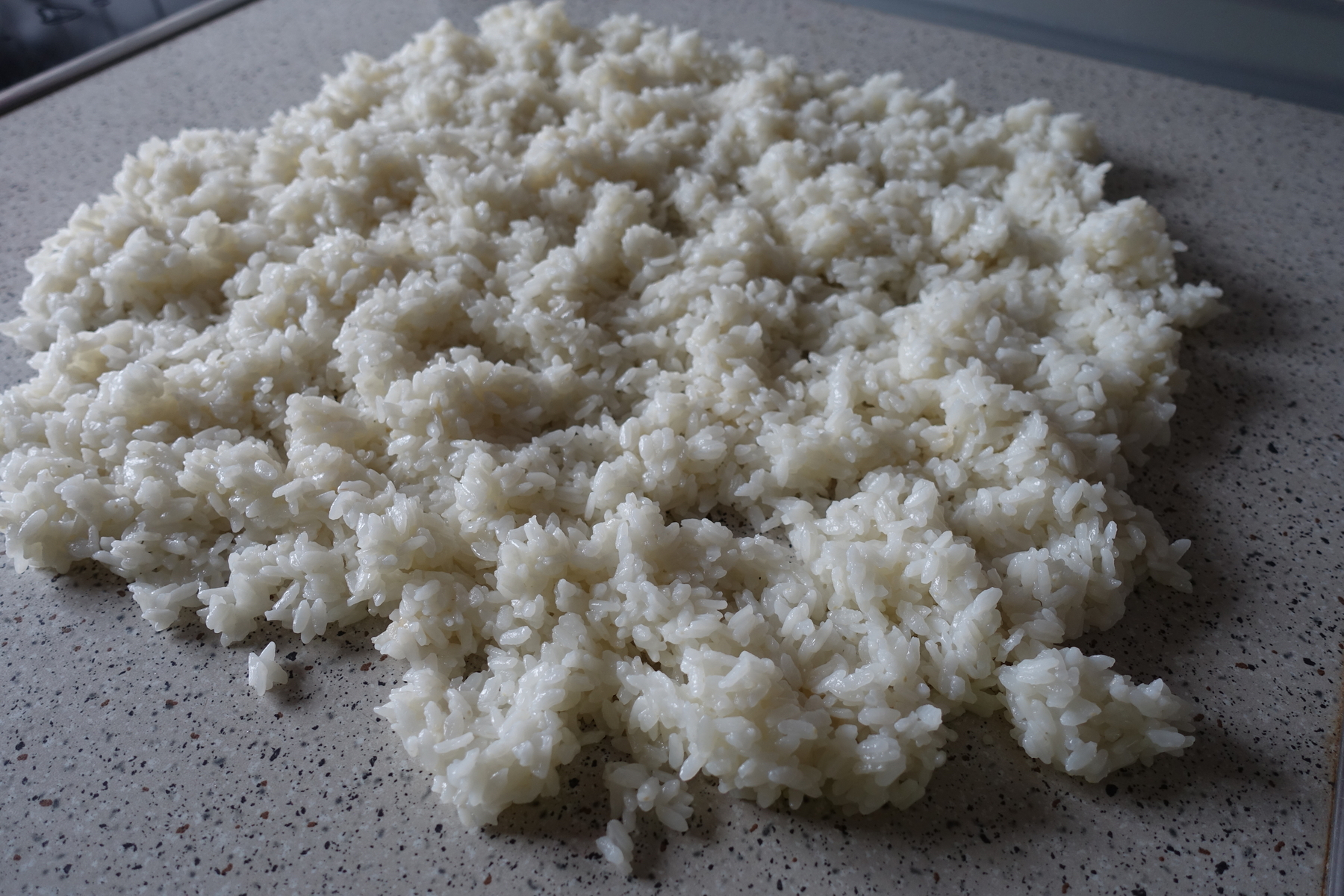 Anschließend den Reis auf einer Arbeitsfläche verteilen, damit er auskühlen kann und nicht zu stark nachzieht.