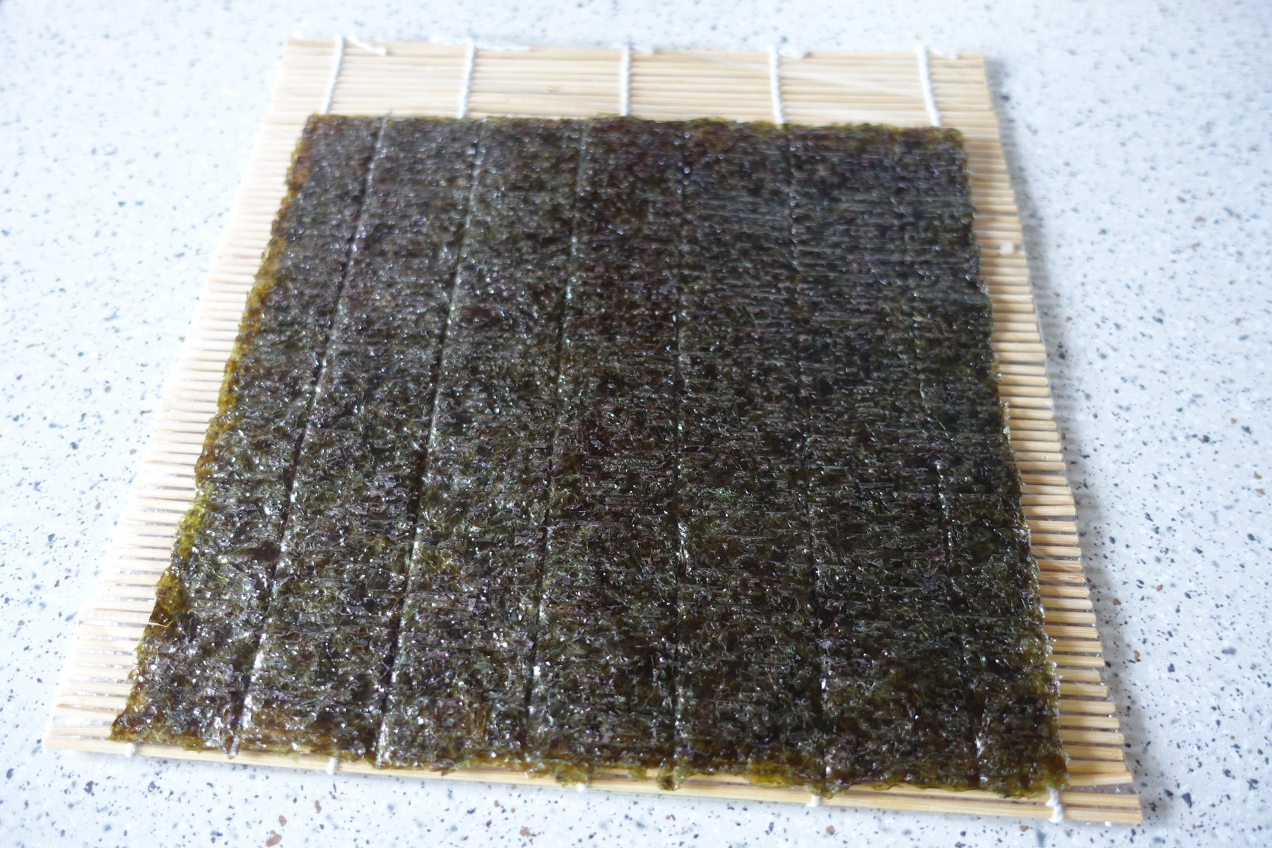 Algenblatt auf Bambusmatte legen und auf 2/3 den Reis dünn verteilen, mit etwas Wasabi bestreichen.