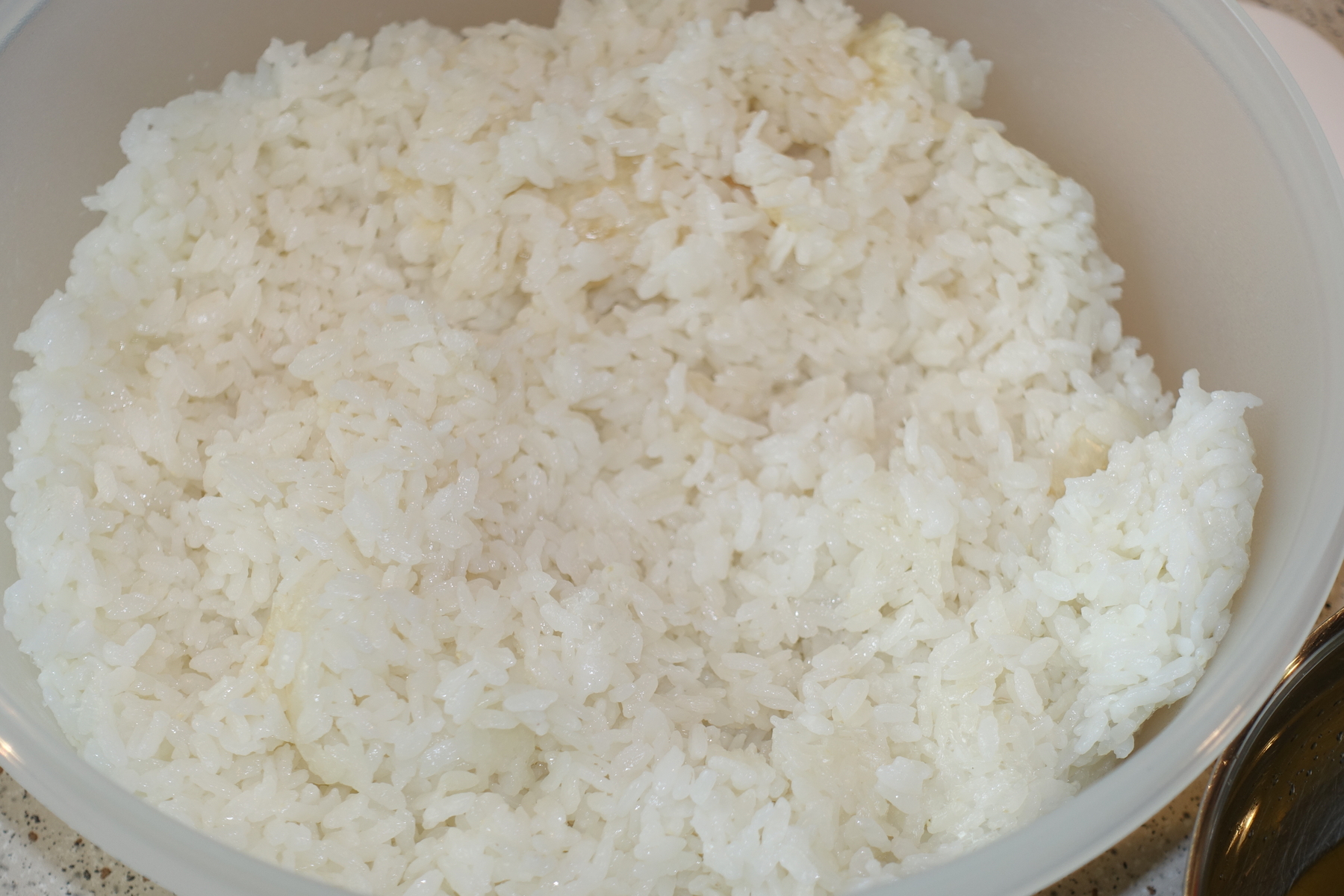 Anschließend den Reis auf einer Arbeitsfläche verteilen, damit er auskühlen kann und nicht zu stark nachzieht.