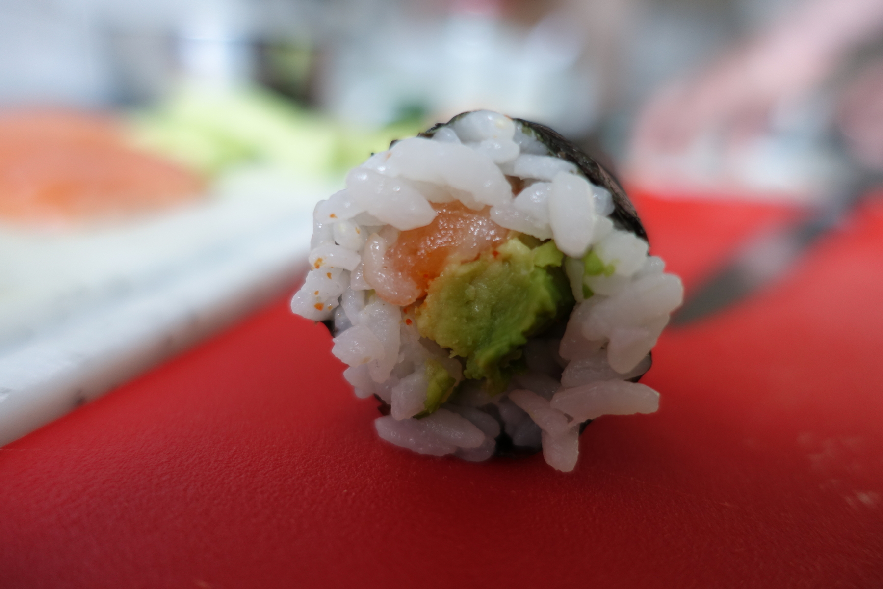 ...anschließend mit Hilfe der Bambusmatte durch leichten Druck aufrollen. Zum Schließen der Rolle das überstehende Noriblatt mit kaltem Wasser befeuchten.