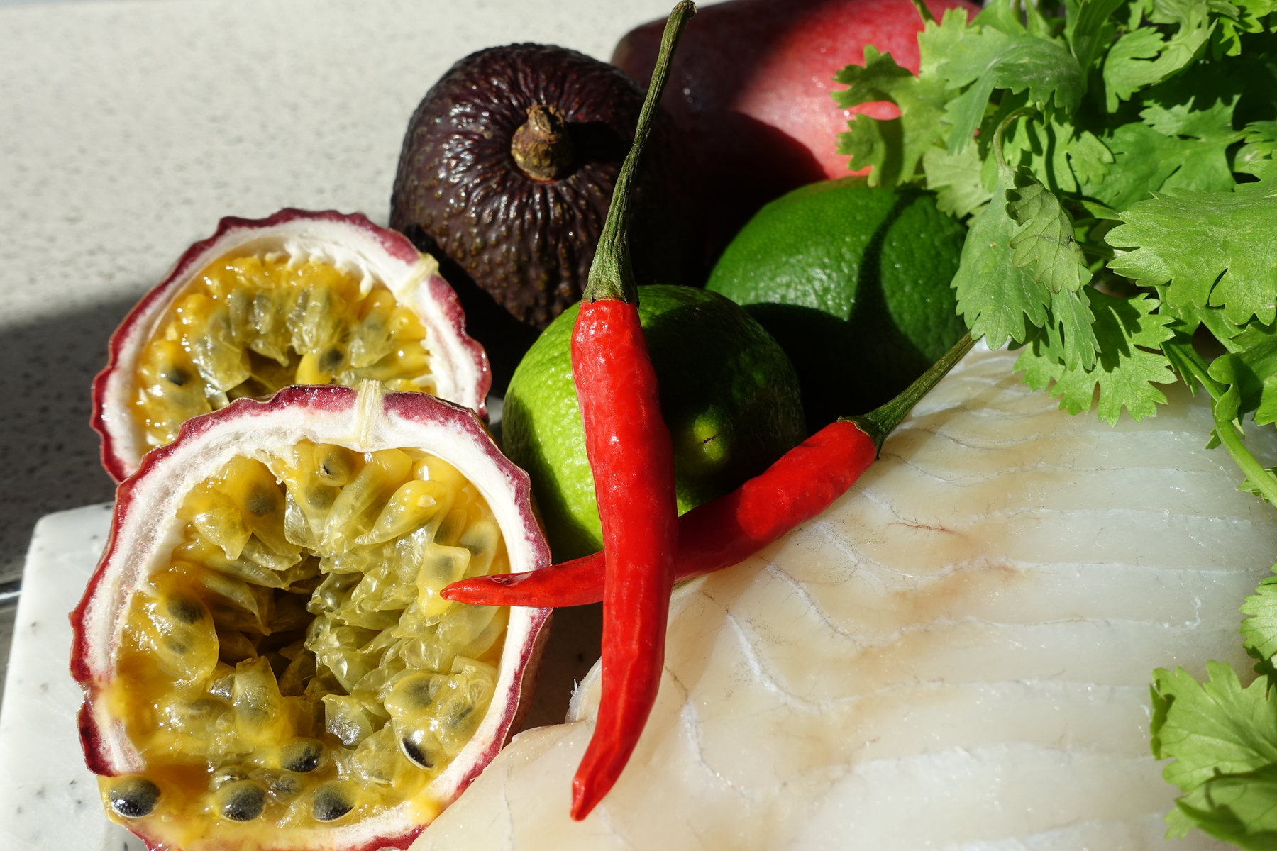 1 frische Passionsfrucht, 1 Mango, 1 Avocado, 2 Limetten, 1-2 Chillischoten (je nachdem welche Sorte und wie scharf es werden darf)