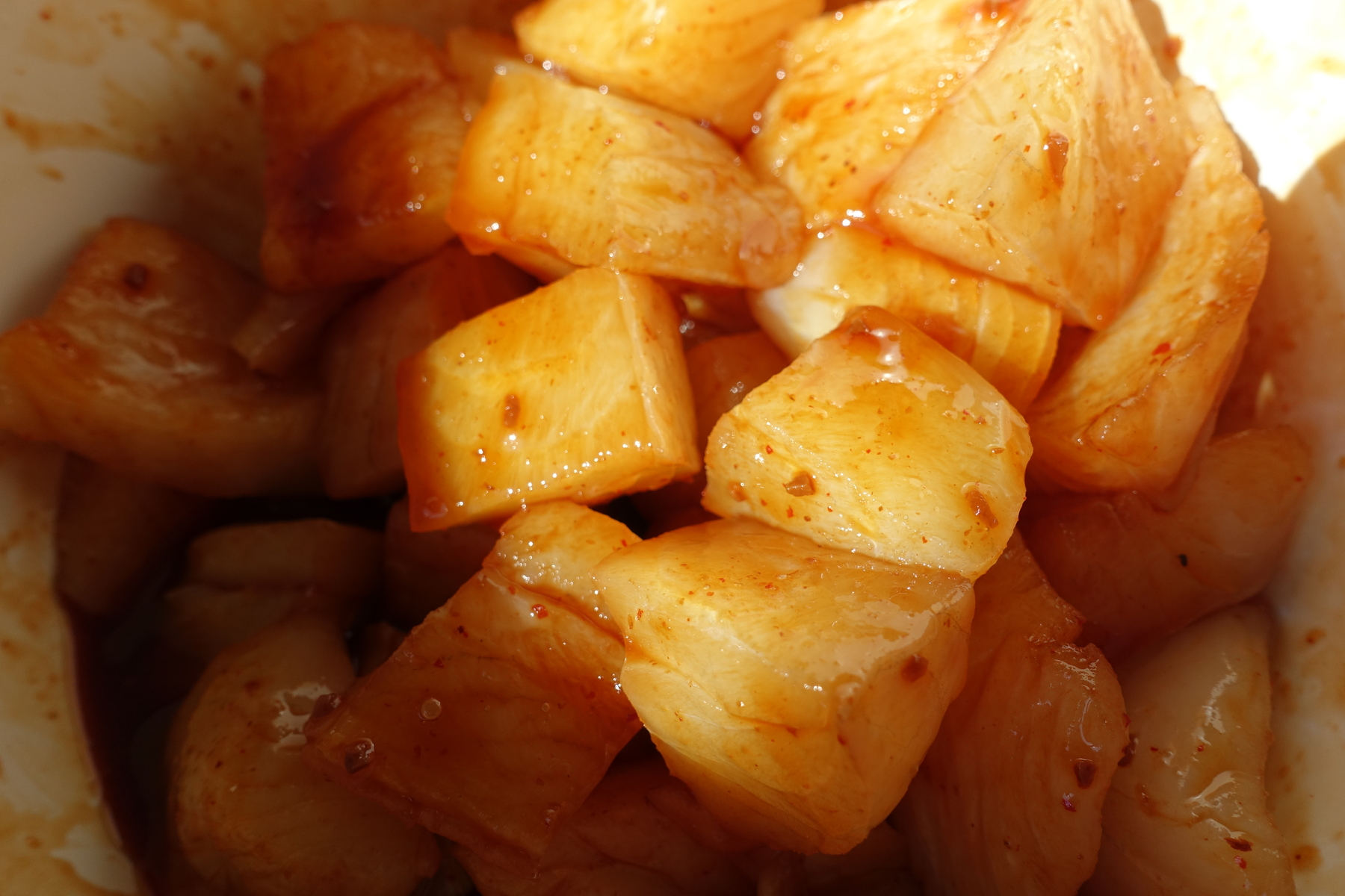 Das Pollackfilet in grobe Würfel schneiden und großzügig mit der Teriyakisauce marinieren