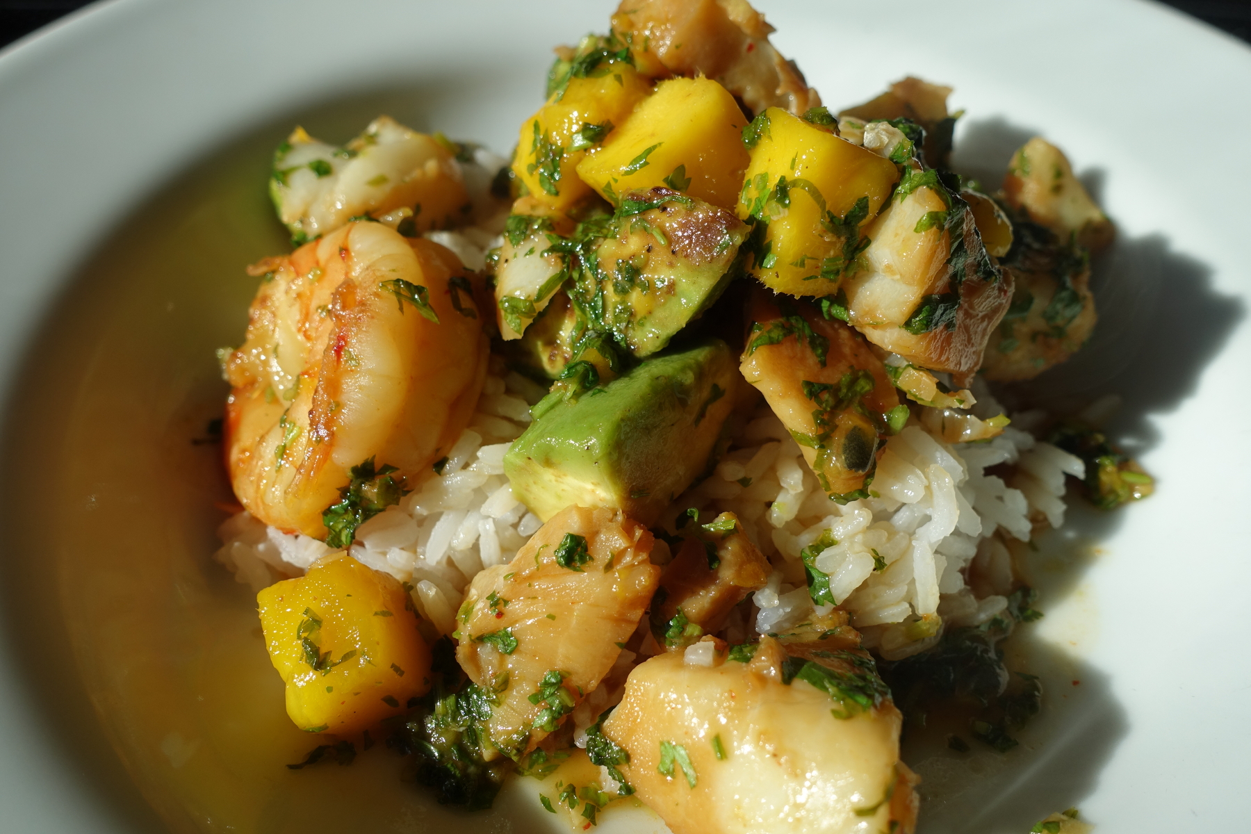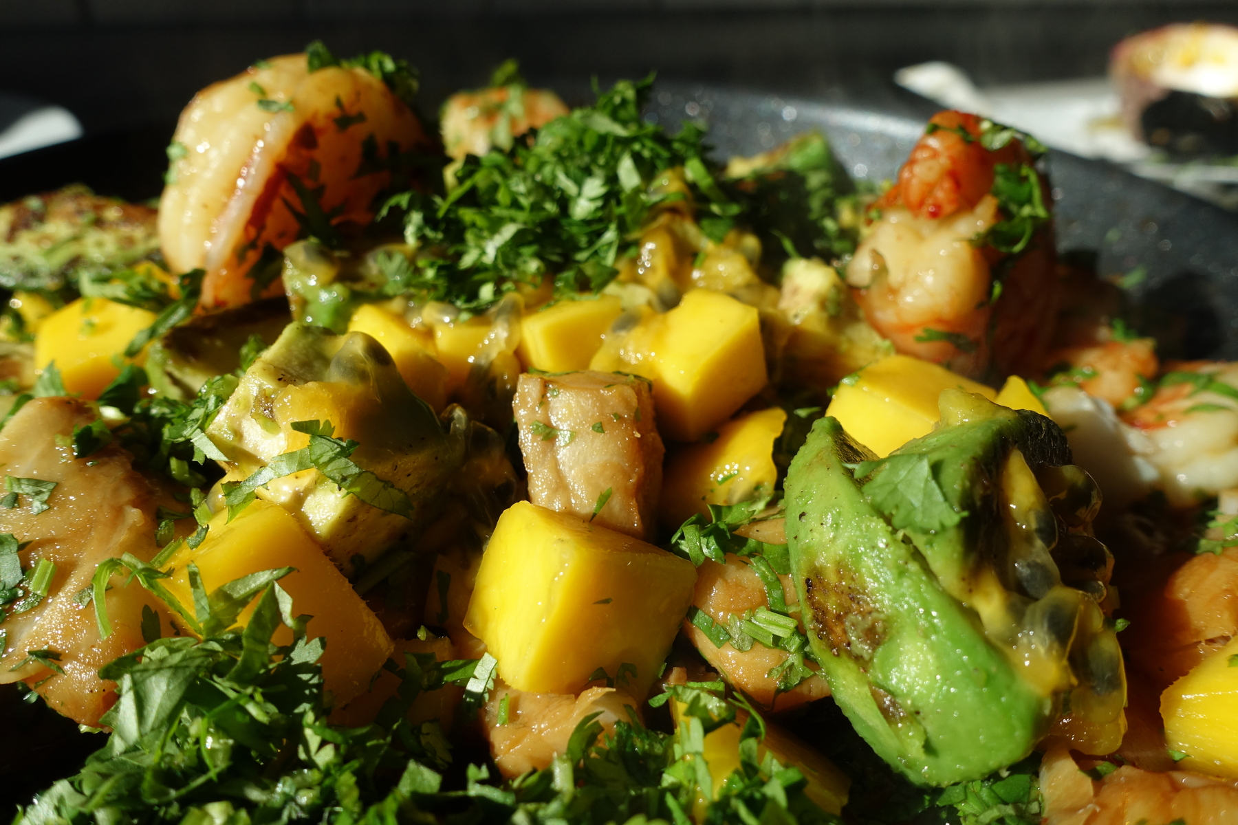 Die Kombination aus Schärfe vom Chilli, süße der reifen Mango, Säure von Limette und Passionsfrucht (die Kerne geben zusätzlich noch ein frisches knackiges Mundgefühl), der cremigen Avocado, dem frischen Koriander...