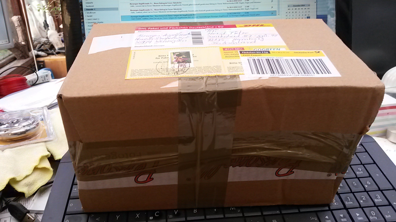Ich hab zwar keine Ahnung, woher das Päckchen kommt, Graphologen würden aber sagen, dass wir seelenverwandt sind und weitgehend die gleichen Interessen und Eigenschaften besitzen. Ich bin eigentlich nicht neugierig, aber mein Interesse ist schon mal geweckt. Falls ich im Paket selbst keinen Hinweis auf mein Julchen finden sollte, muss ich in 2017 an unserem Infostand mal mit einer Flasche Eierlikör (aber selbst gemacht und mit 28% Reinheitsgrad, damit ich mit einer Flaschen auch zum Ziel komme) vorbeischauen.