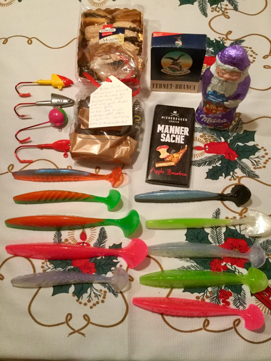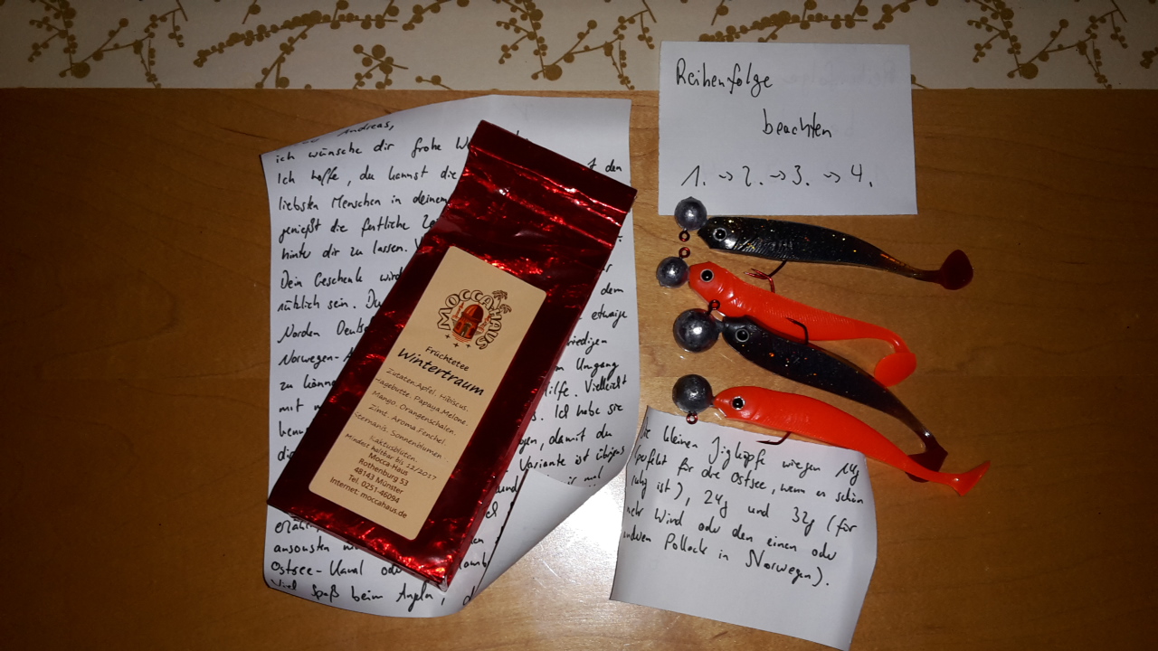 Bei mir war der Weihnachtsmann auch aktiv und hat mir viel Freude geschenkt.Großes:Danke: geht an Philip aus Kiel. Die Gummiköder werden auf alle Fälle in die Köderkiste kommen:baby: und der Tee wird bei dem momentan doch recht ungemütlichen Wetter auch eine kurze Lebensdauer haben:wave:.