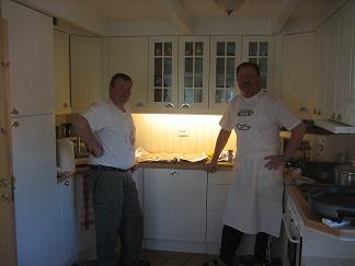 Unglaublich dass der ganze Bettel in den Bus passt, aber dann Punkt 20.00 Uhr starten wir gen Dänemark. Wie immer vier Stunden zu früh drücken wir uns am Fähranleger in Hirtshals rum und bewundern die neue Superspeed I. Mit rd. 20 Minuten Verspätung auf Grund mächtigen Windes legen wir ab ... und kommen mit weiteren 15 Minuten Verspätung in Kristiansand an. Ab auf die Grüne Spur ( wirklich nur geringfügigste Mengen zuviel an Bord !) und durch nach Farsund. Dort erwarten uns an der Statoil-Tanke die wirklich netten Alf und Marie Syvertsen (Haus 206, R. Frühling) und zeigen uns schon mal Haus 172 (Rolf Kjell, in Urlaub). Von dort aus geht’s zu Farsundklaus, der uns in seinen Kutter einweist (schönes Teil, sparsam, mit GPS, Plotter und Echolot technisch hervorrragend ausgestattet). Klaus zeigt uns drei Stellen vor der Küste, empfiehlt aber ein Plateau südlich Lomesanden. Gegen 19.30 Uhr erreichen wir dann Alf’s Haus. Dort liegt noch ein Zettel vom Vormieter und NAF Helvikfjord : er teilt uns mit dass in den Schären nix geht und man raus müsse nach Ystesteinen, Kletten usw. Ausgepackt, Grill angeschmissen, saarlännisch gudd gess und flach gelegt ...