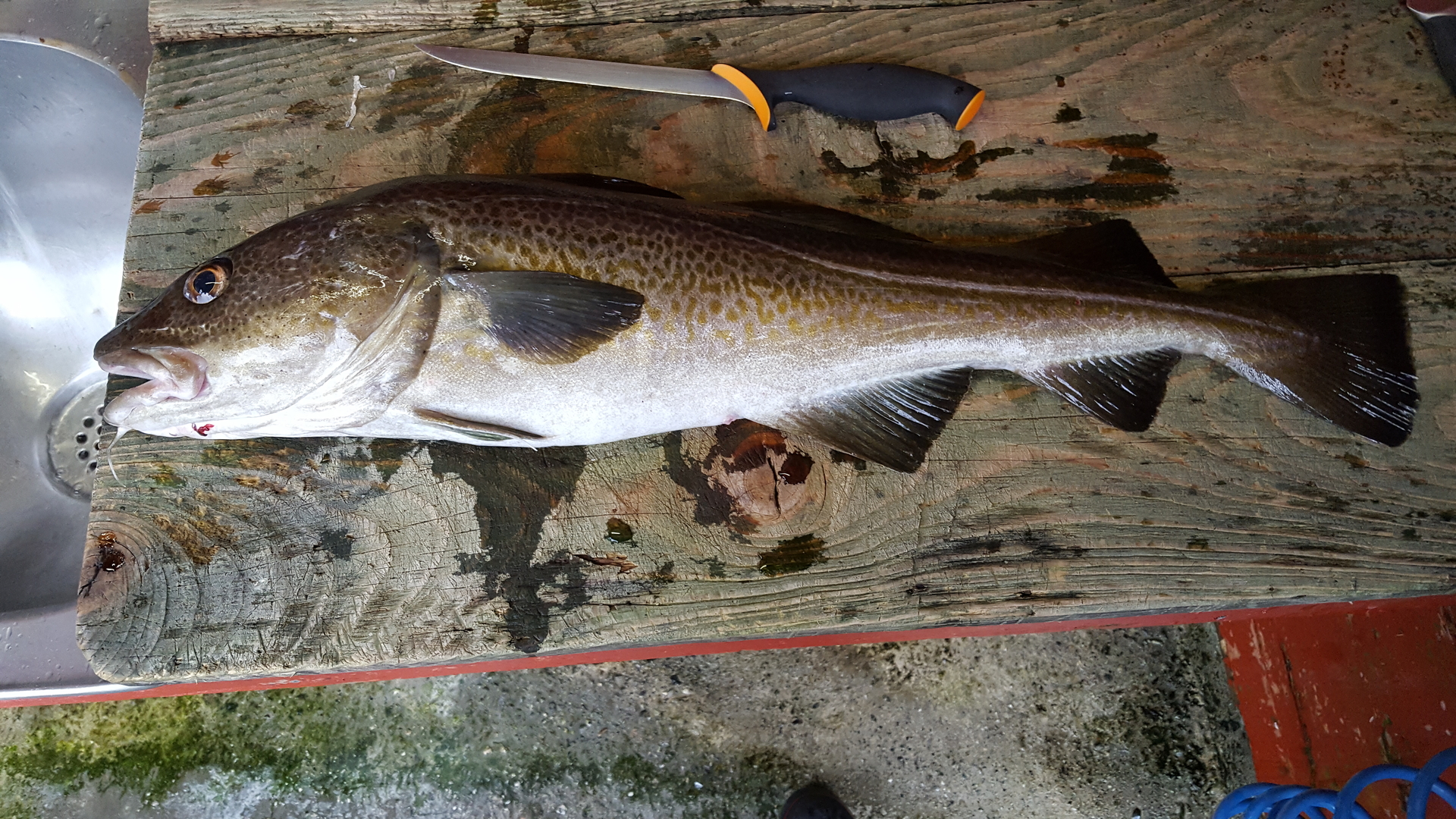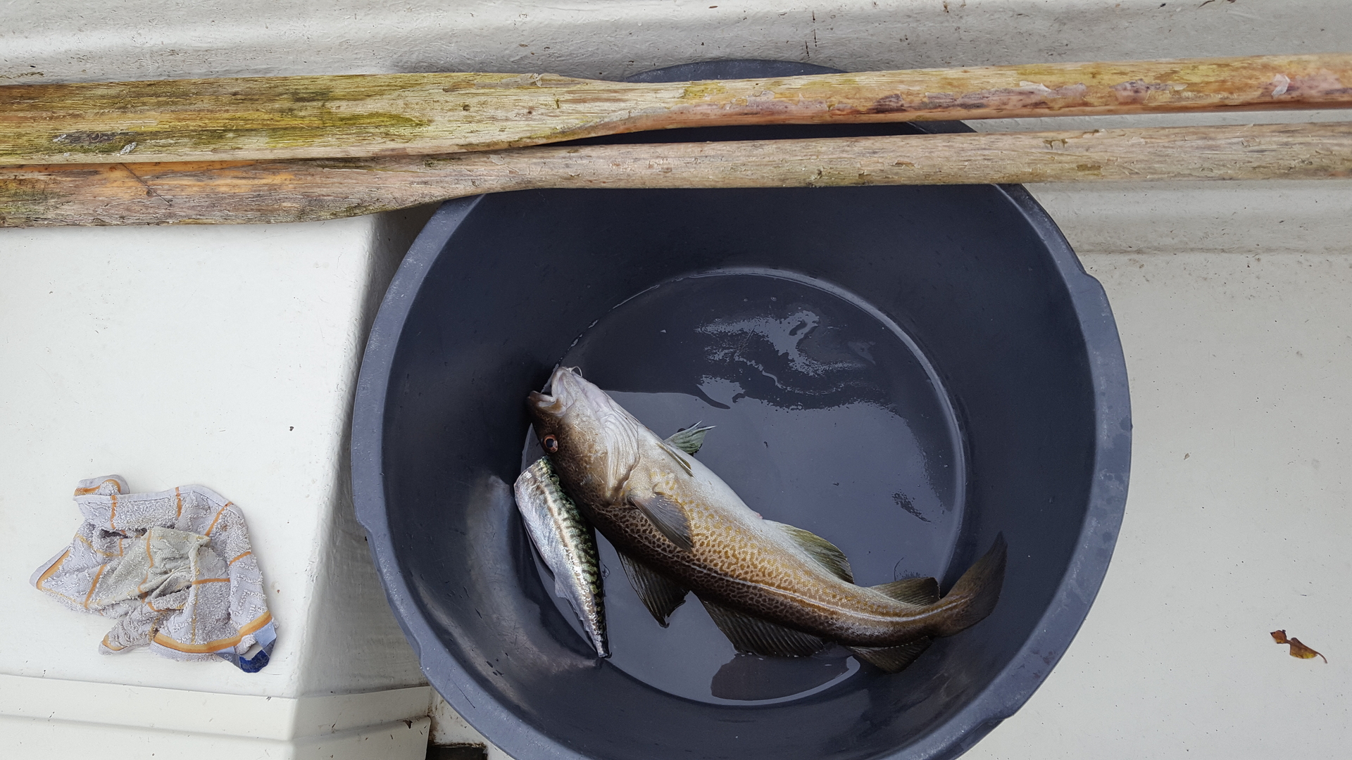 In der Nähe, wo ich von Land aus den Pollack fing, biss gleich beim 1. Runterlassen eine große Makrele. Danach fuhr ich zur anderen Fjordseite hinüber, wo ich einen schönen Dorsch fing.