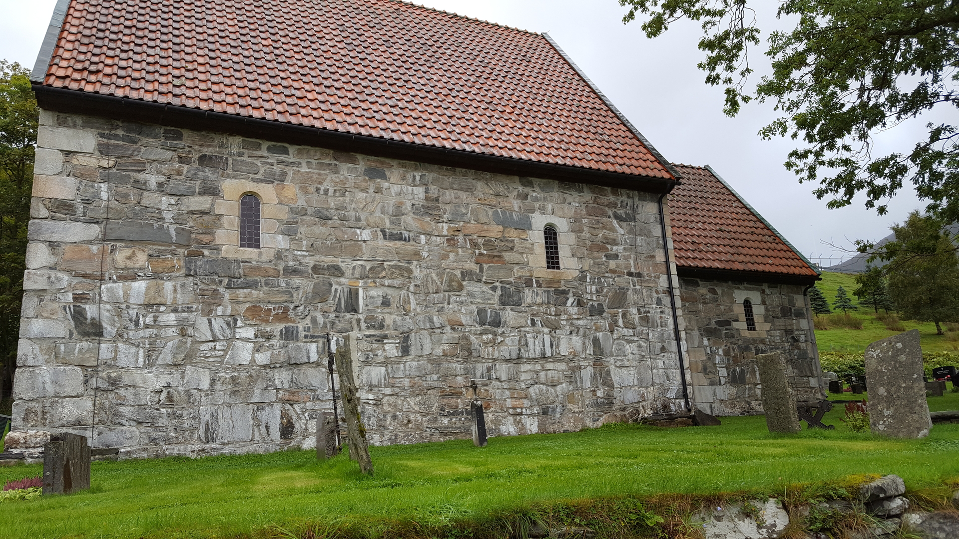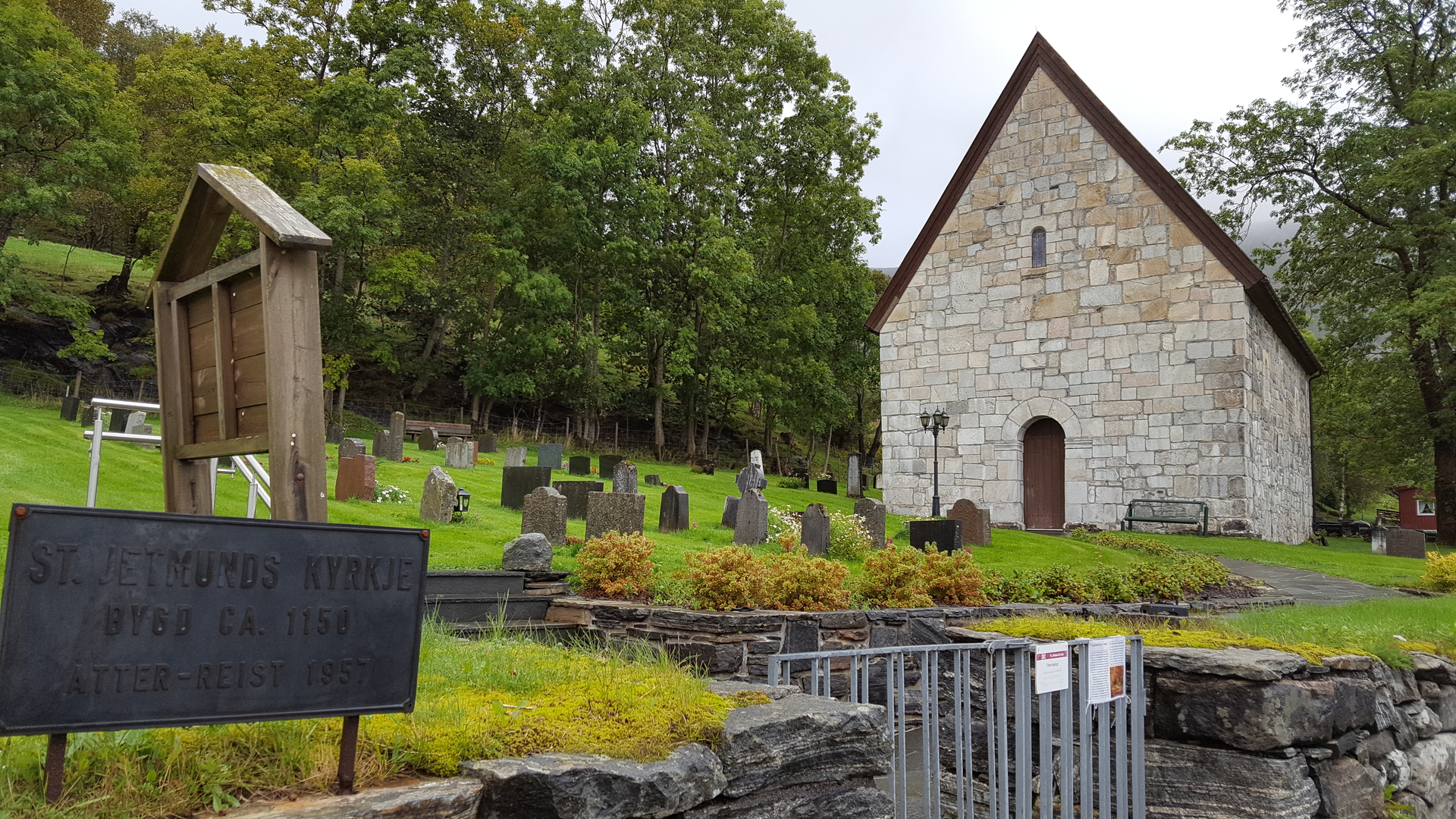 Auf dem Rückweg hatten wir in Åheim an der St. Jetmunskyrkja Halt gemacht. Sie ist eine charakteristische, alte Kirche. Sie hat ihren Namen nach St. Jetmund (Edmund), einem englischen König, der als Märtyrer im Jahre 870 starb. Diese Kirche stammt aus dem frühen Mittelalter, wahrscheinlich um 1150.