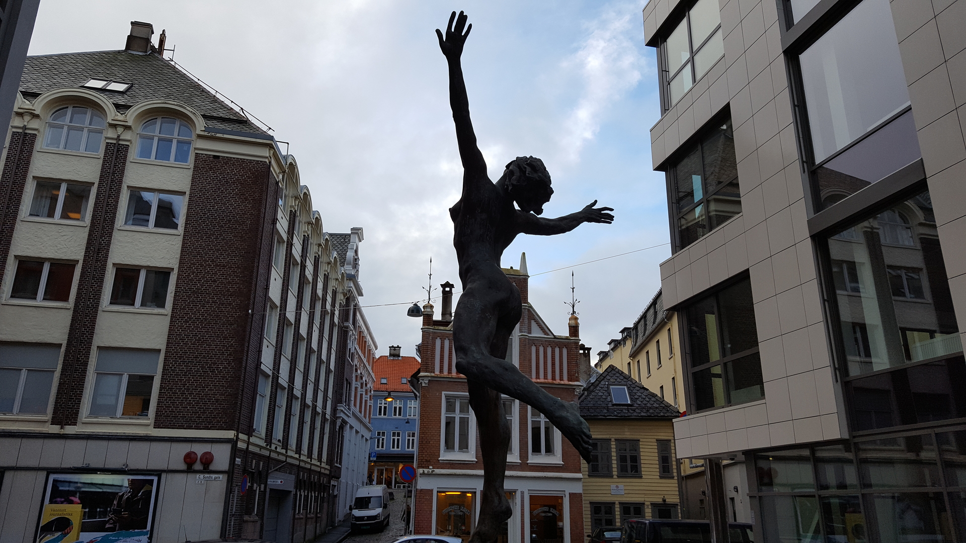 Da die Fähre wetterbedingt Verspätung hatte und dementsprechend auch 2 Stunden später von Bergen wieder ablegen sollte, hatten wir Zeit, um Bergen ein klein wenig zu erkunden. Den Fløyen, Bryggen, Fischmarkt - da waren wir schon oft. Der Fischmarkt zieht nun wohl bei schlechtem Wetter in die Fischhalle am Hafen, in dessen Gebäude sich auch die Touristinfo befindet. Irgendwie ist damit das Flair des bisherigen Fischmarktes verloren gegangen, so finden wir jedenfalls.