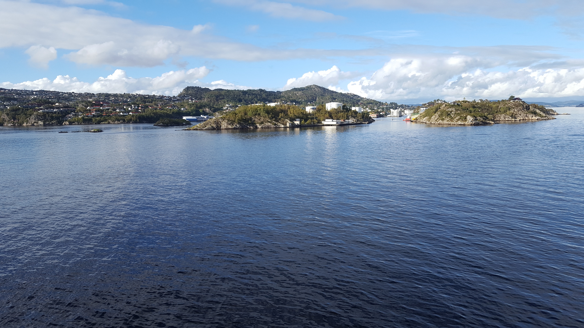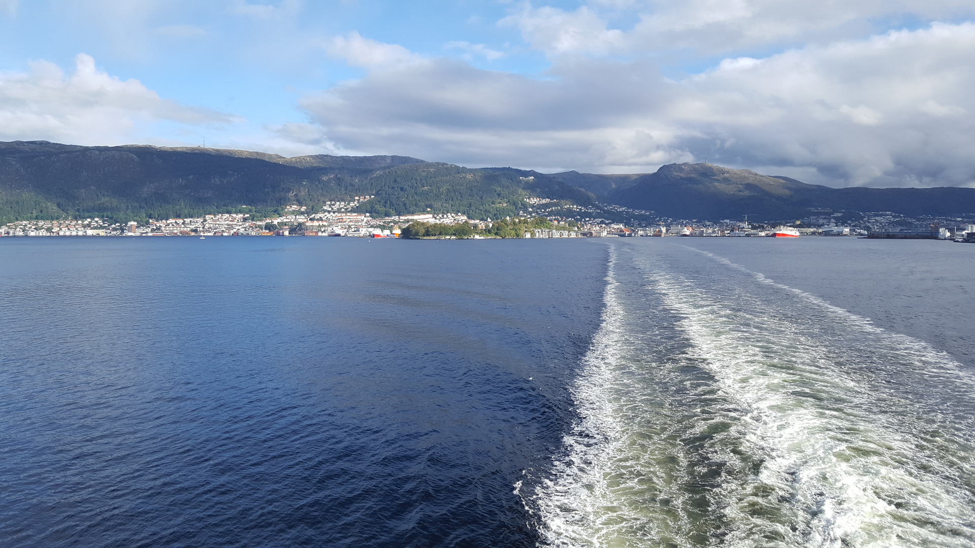 Bei Sonnenschein legte die Fjordline mit über 2 Stunden Verspätung ab. Es war eine schöne Ausfahrt aus Bergen. Wir blickten zurück auf die Stadt, deren markante Punkte der Hausberg Fløyen und der noch höhere Ulriken waren. Obwohl wir auf der Hinfahrt schon viel gesehen hatten und meist draußen standen, so wollten wir die letzten Stunden noch ganz viel von Norwegen in uns aufnehmen und so diesen wunderbaren Urlaub ausklingen lassen.