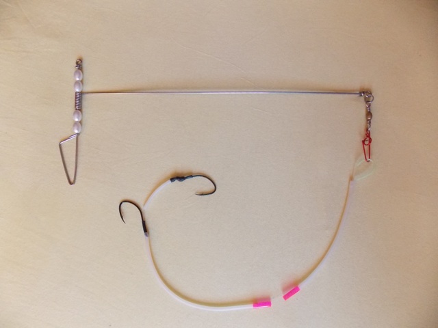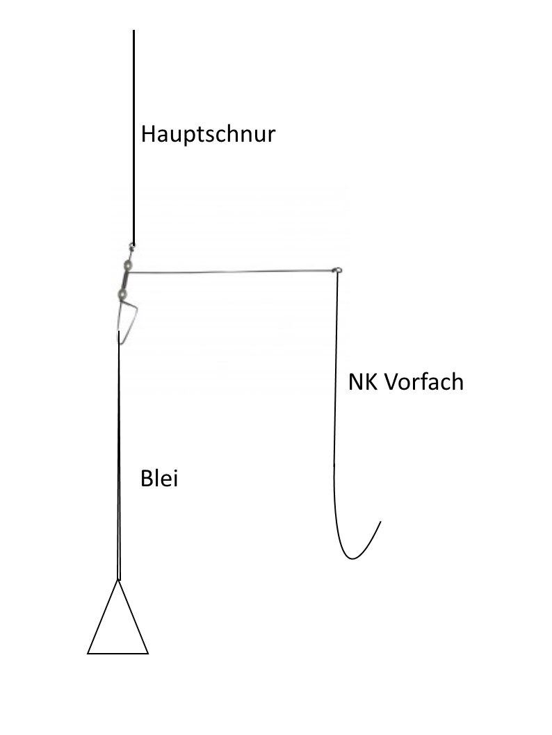 Wähle den Drahtarm nich zu schwach! Unten zum Blei 1m 40er Mono als Abriss Schnur. Die Mundschnur kann so lang wie die Abriss Schnur sein. Daran ein Makkrelenfilet mit Kabelbinder am Doppelhakensystem gesichert und der Spass beginnt.