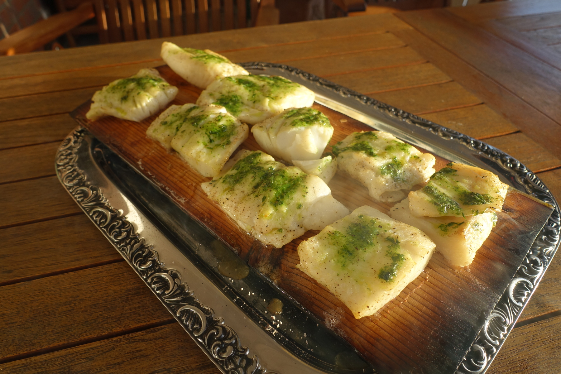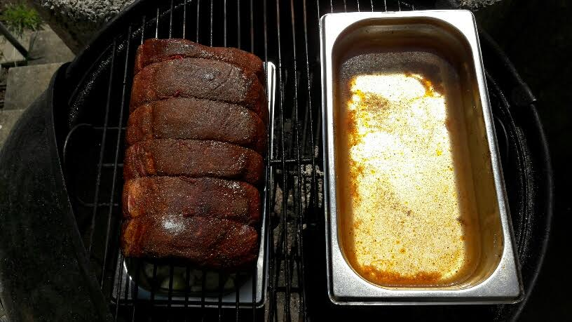 danach werden alle schwarzen Stellen entfernt, die Folie braucht ihr nicht zu entfernen. ich hatte ca. 800g Abschnitte. Danach habe ich das Stück mit Wurstgarn fixiert. mit etwas Olivenöl und meinem Hausgewürz gewürzt und über Nacht mariniert. den Grill vorbereitet(siehe Spare Rips), in die Abtropfschale Zwiebeln, Knoblauch und Wasser gefüllt.