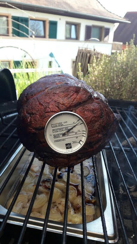 Den Grill angefeuert.eine 2. Schale mit Wasser über den Kohlen platziert (hält die Temperatur unten und verhindert das Austrocknen. Deckel drauf, fertig. Nach 2 Stunden sah es dann so aus. Das Stück wäre jetzt medium rare, für die die es mögen. Meine Mädels bevorzugen eine etwas andere Garstufe, also geht es in die nächste Runde. Habe etwa 1/2 Grillkamin glühender Kohlen nachgelegt, die in Alufolie gewickelten Kartoffeln unter den Braten gelegt, die Abtropfschale von unten nach oben gestellt und die Schale mit etwas Wasser aufgefüllt. Deckel drauf fertig.