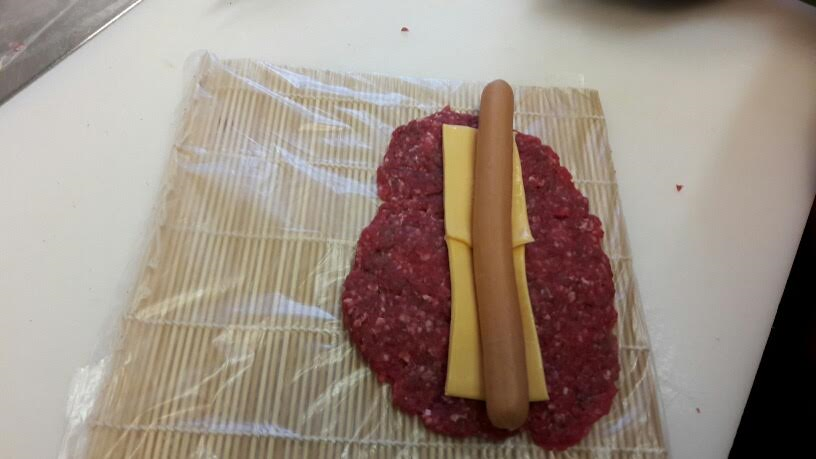 dann rollt man das gewürzte Fleisch auf einer Sushi Matte (kost fast nix und gibt's in jedem Supermarkt, Edeka z.B. hats#zwinker2*)