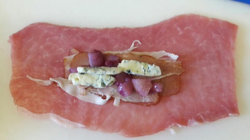 Diese werden zwischen Folie auf ca. 2mm plattiert.Darauf habe ich dann rohen Schinken, nach Wahl und Geschmack, gelegt.