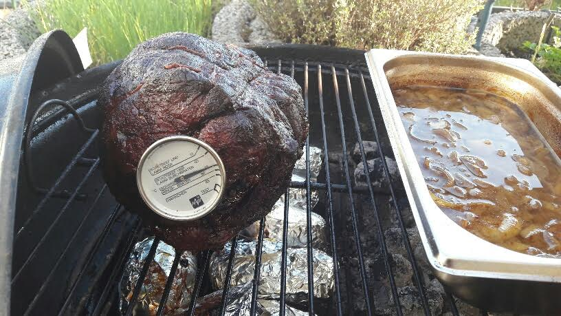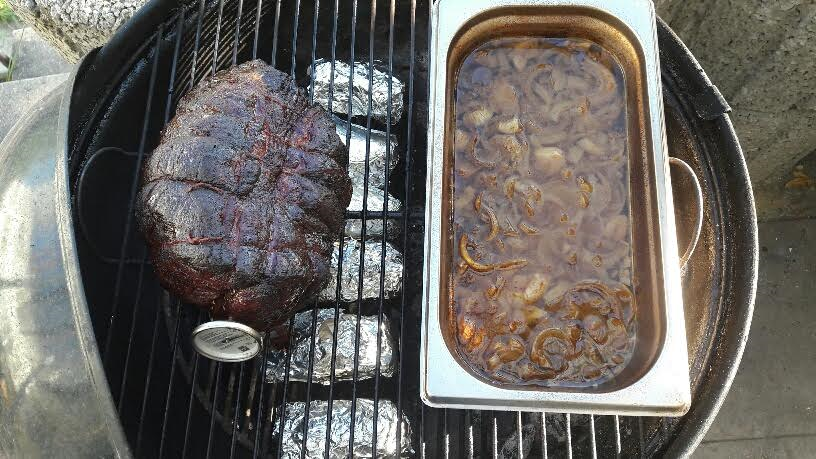 Das Stück wäre jetzt medium rare, für die die es mögen. Meine Mädels bevorzugen eine etwas andere Garstufe, also geht es in die nächste Runde. Habe etwa 1/2 Grillkamin glühender Kohlen nachgelegt, die in Alufolie gewickelten Kartoffeln unter den Braten gelegt, die Abtropfschale von unten nach oben gestellt und die Schale mit etwas Wasser aufgefüllt. Deckel drauf fertig.