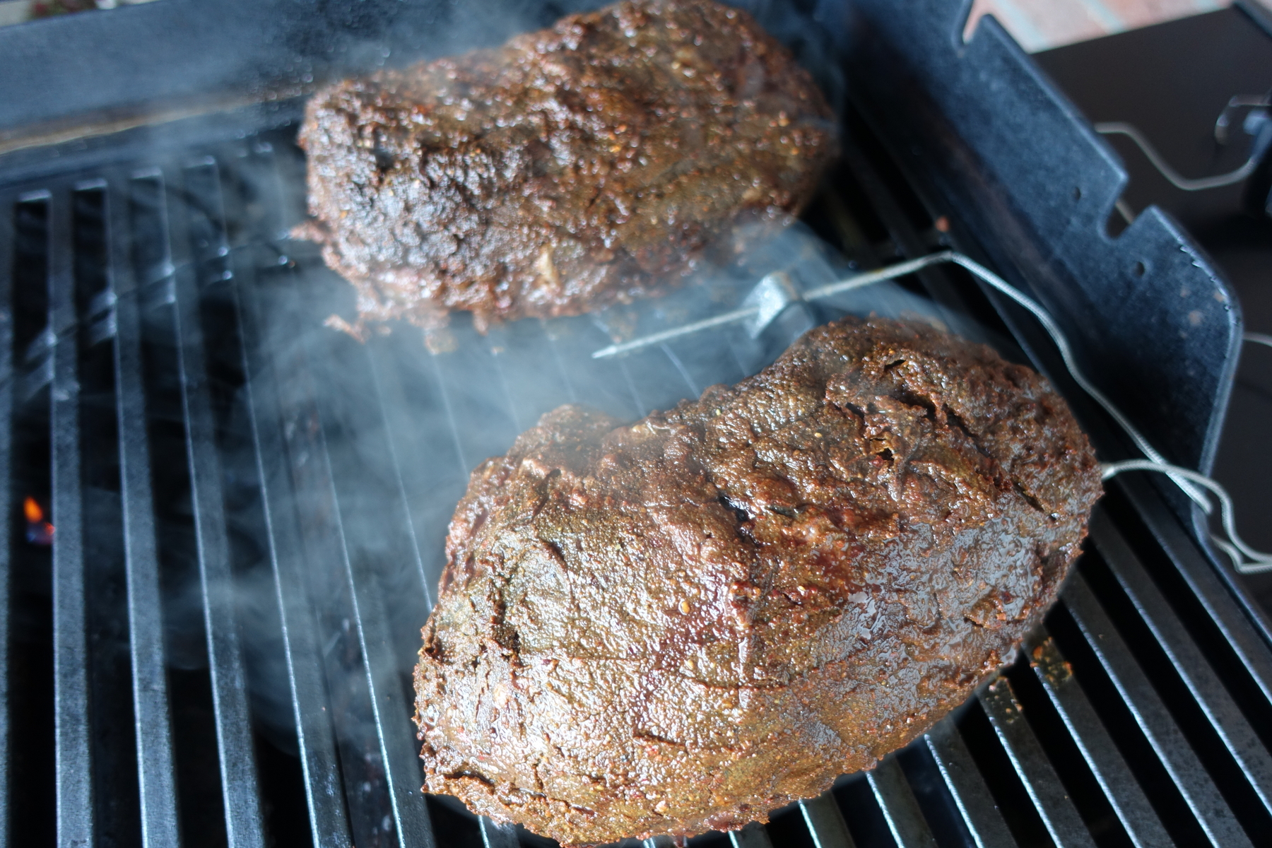 danach werden alle schwarzen Stellen entfernt, die Folie braucht ihr nicht zu entfernen. ich hatte ca. 800g Abschnitte. Danach habe ich das Stück mit Wurstgarn fixiert. mit etwas Olivenöl und meinem Hausgewürz gewürzt und über Nacht mariniert. den Grill vorbereitet(siehe Spare Rips), in die Abtropfschale Zwiebeln, Knoblauch und Wasser gefüllt.