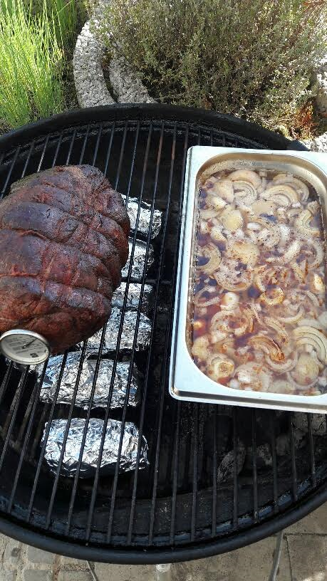 Den Grill angefeuert.eine 2. Schale mit Wasser über den Kohlen platziert (hält die Temperatur unten und verhindert das Austrocknen. Deckel drauf, fertig. Nach 2 Stunden sah es dann so aus. Das Stück wäre jetzt medium rare, für die die es mögen. Meine Mädels bevorzugen eine etwas andere Garstufe, also geht es in die nächste Runde. Habe etwa 1/2 Grillkamin glühender Kohlen nachgelegt, die in Alufolie gewickelten Kartoffeln unter den Braten gelegt, die Abtropfschale von unten nach oben gestellt und die Schale mit etwas Wasser aufgefüllt. Deckel drauf fertig.