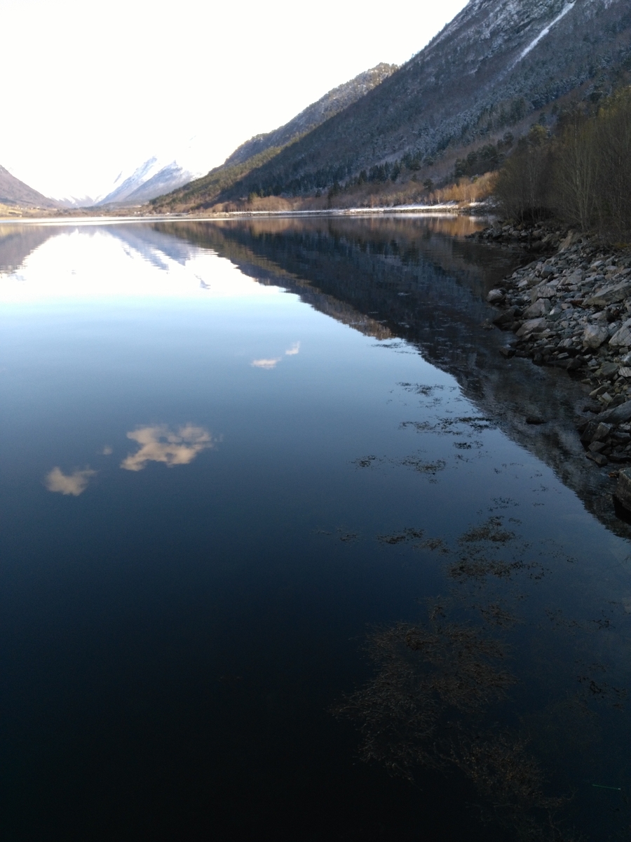 Mittags-Mefo's zählen. Da läuft ein kleiner Bach in den Fjord vor dem