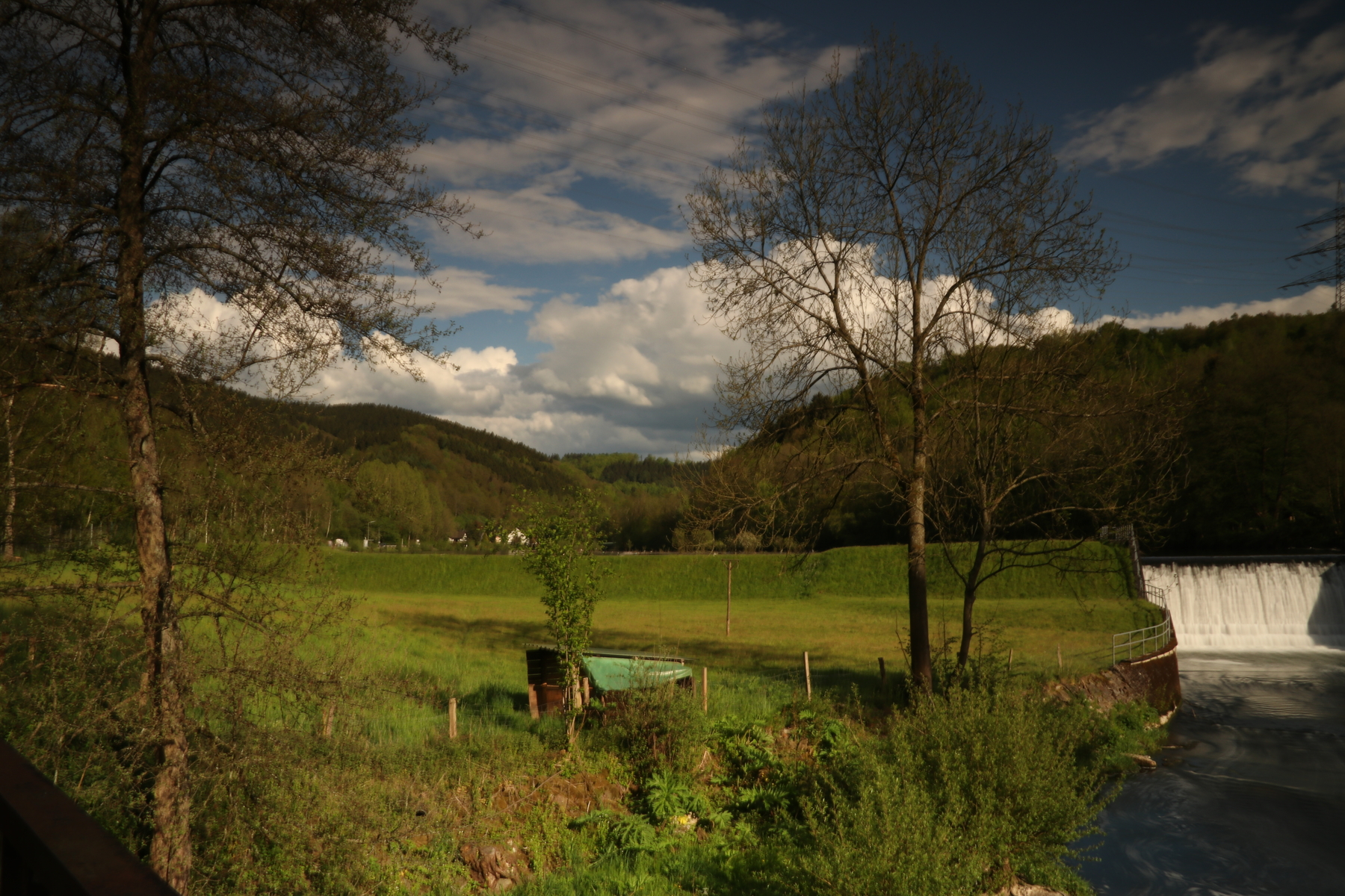 Hier mal ein Beispiel von mir. Das Bild entstand im tiefen Waldmit hellen Himmel. Entsprechend hab ich mit einen Verlaufsfilter den Himmel in der Helligkeit reduziert, den Weisabgleich auf den vorderen dunkleren Bereich ausgerichtet und in Modi M gearbeitet. Bas Bild selber entstand aus 5 Bildern, ist also eine Panoramaaufnahme.