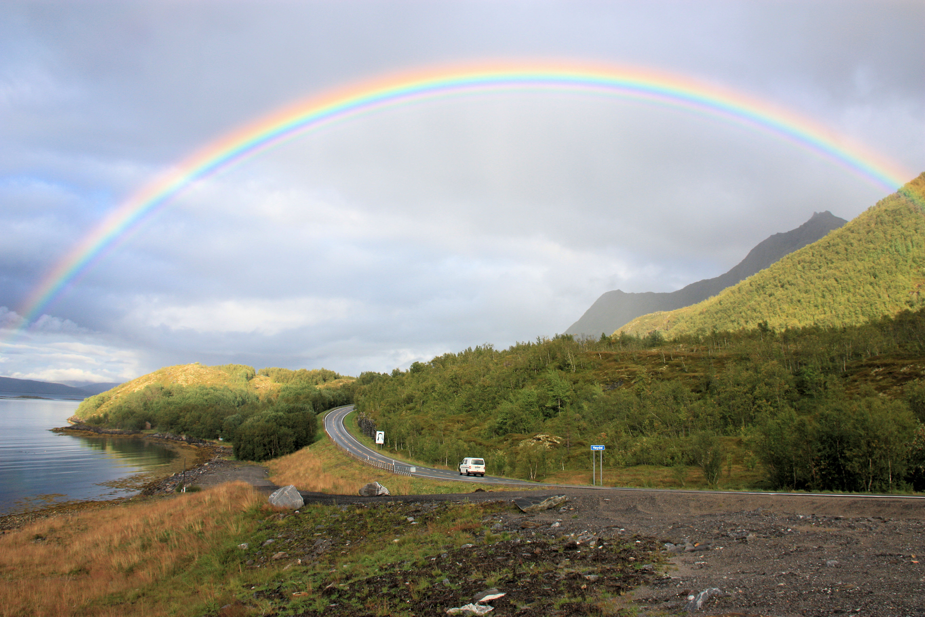 148. auf dem Weg dorthin stand dann plötzlich ein gewaltiger Regenbogen über uns - ging vom Berg bis in den Fjord und so, dass der Bulli durch "musste" nach ein bis zwei Bilderchen, Das war ein sehr schöner Moment..und passte so richtig zur Stimmung "an Bord"