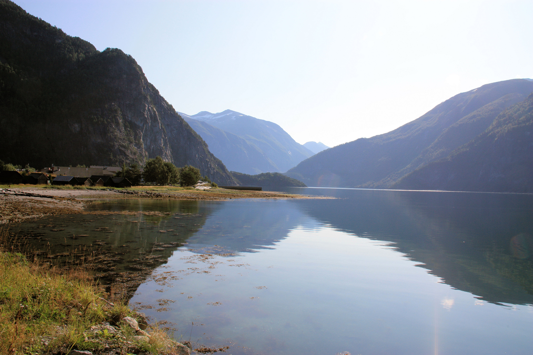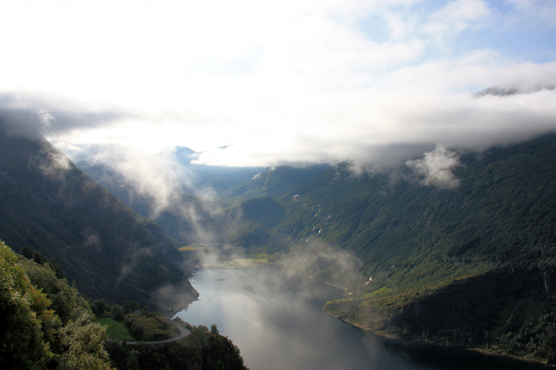 45. Natürlich mussten wir weiter, nach der nächsten Fähre wurden wir in Valldal aufgehalten - von einem Fjordblick zu "ebener Erde", allein dieses ständige Auf und Ab in den Höhen macht einen, wenn man über das Grandiose nachdenkt, schon verrückt.