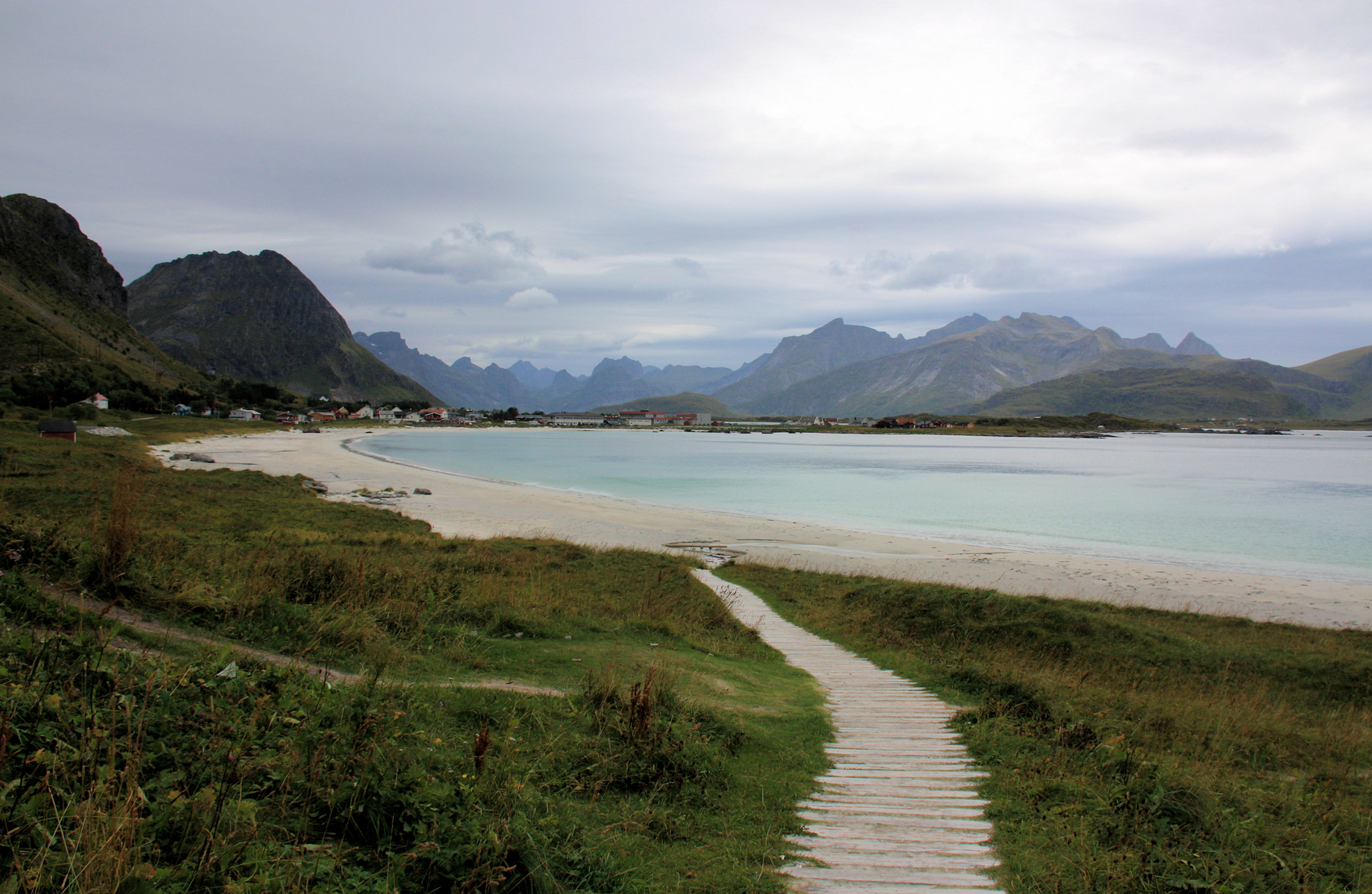 271. wir dachten dann: Verlassen wir eben die E 10 so oft es nur geht - vielleicht haben sie diese Fotofallen nur da aufgebaut - dieses - "..hinter jeder Ecke wird es noch verrückter" - den Plan führten wir aus - hatte nur keinen Sinn: nächste Ecke - an der Kjerkveien (die hat nicht einmal mehr eine Nummer) bei Flakstad - standen dann diese hier - vor einem solchen Panorama - ach hör doch auf!!