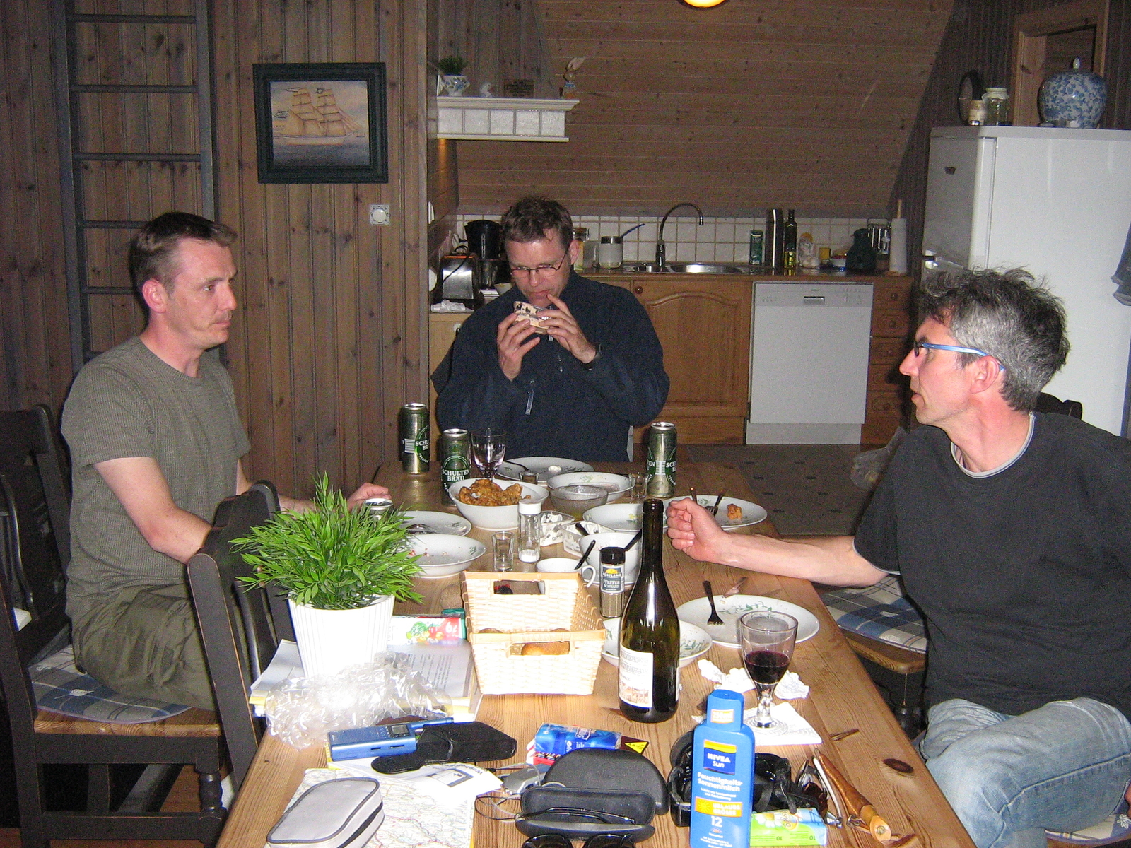 Nachdem ich eigentlich am Freitag Abend um so um 20.00 Uhr ins Bettchen wollte und extra 2 Schlaftabletten in Form von zwei Bierchen zu mir genommen hatte,wurde es schließlich 21.30 Uhr.An Schlaf war irgendwie gar nicht zu denken und um 0.30 Uhr klingelte auch schon der Wecker.Au weia dachte ich noch,höchstens 1Std. gepennt,das fängt ja gut an.Aber egal der Gedanke das es endlich los geht ins gelobte Land verdrängt ja doch alles andere.Um 2.00 Uhr ging es dann nach auflesen von den drei anderen Verrückten auf die A1 Richtung Norge.Die Fahrt verlief reibungslos und um 9.30 Uhr standen wir dann am Fähranleger in Hirtshals.Da auch im Auto auf der fahrt an Schlaf nicht zu denken war,(Gequatsche vom riesen Leng und ein kribbeln im Bauch welches ich nur von meiner ersten großen Liebe kannte,ließen dies nicht zu) wurden es lange Stunden bis die Super Speed um 11.30 Uhr endlich ablegte.Auf der Fähre war es dann so weit.Leichte Wahrnehmungschwierigkeiten machten es klar,Schlaf muss her.Aber wie es so im Leben ist und da das Ablegen vom Aussendeck beobachtet werden muste hieß es : Wer zu spät kommt den bestraft das Leben.Außer im Selbstbedienungsrestaurant war kein Plätzchen mehr frei.Und im selbigen wurden wir freundlich aber energisch darauf hingewiesen : No Sleeping here. Na gut dann eben mit Hilfe von Drogen.Ein Kaffee nach dem anderen und eine halbe Schachtel Zigaretten ließen auch die 3Std. Überfahrt vergehen.Dann ging es auch schon weiter.Ab auf die grüne Spur.hatten ja schließlich höchstens ein paar Bierchen zu viel mit.Das sah auch der Zöllner schon von weitem und winkte uns freundlich durch.Die fahrt auf der E39 nach Feda verlief recht flott.Voller Müdigkeit wurden doch einige markante Punkte am Wegesrand wiedererkannt.Um 17.30 Uhr dann der erste Blick von der neuen Fedabrücke auf "unseren" Fjord.Ententeich und Sonnenschein ließen es geschehen.Von Müdigkeit war keine Rede mehr.Im Gegenteil einstimmig hieß es : Wir müssen heute noch raus.Dorschpapas Zweitwohnung war schnell gefunden und nach der Begrüßung durch Sissel wurde in Windeseile ausgepackt und Quartier bezogen.Der erste Blick vom Balkon der Ferienwohnung verzögerte die Bootseinweisung noch mal.Ein Anblick der das Herz laut hörbar Schlagen ließ.Selbst von hier oben(Luftlinie ca.200m)waren im glasklaren Wasser die Steine zu erkennen und die Forellen sprangen im Fedariver.Der Blick über Feda auf den Fjord einfach nur ein Traum."Dorschpapa wir verstehen jetzt deine Liebe zu diesem Haus." Um 19.00 Uhr dann die Bootseinweisung duch Glenn die mich als Skipper doch arg erschreckte.Eine über mehrere hundert Meter nur 1,5m breite und teilweise nur 60cm tiefe Fahrrinne.Wow.Nun ging es aber raus auf den Fjord.Ab zum Naffen Tip Nr.1 (Danke Sam) Vor der Felsnase ging dann auch gleich die Post ab.Vier Pilker sausten in die Tiefe.Zwei mal 80g mit Heringspaternoster und zwei mal 25g blank.In allen vier Ruten rumpste es.Zwei mal Full House mit Markrele und zwei Polack von ca.50cm.Fisch versorgt und weiter gings.Alle Ruten auf 25g blank umgestellt und der Spass kannte keine Grenzen.Lipfische,Köhler,Polack,Markrelen und als Krönung noch ne 45er Mefo.Dann noch ein Versuch unter der Brücke,welcher uns noch Köhler bescherte.Der Blick auf die Uhr und das Magenknurren ließ uns dann aber abbrechen und reinfahren.Zwei Mann versorgten die Fische und zwei Mann grillten noch schnell.Mit ein paar Bierchen wurde der neue Tag begrüßt.Unglaublich nun war es schon 2.00 Uhr.Egal morgen erst mal ausschlafen.Totmüde aber überglücklich vielen wir schließlich ins Bett.