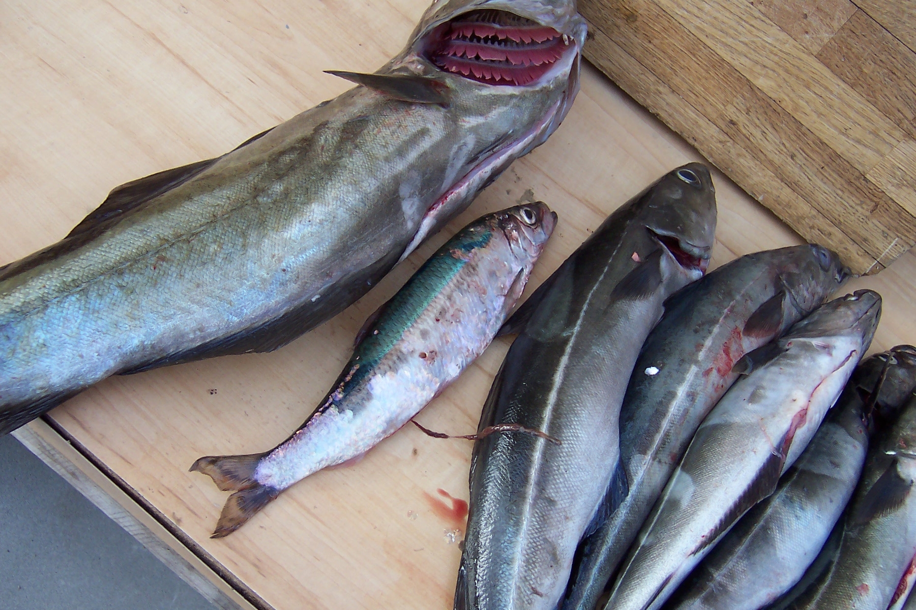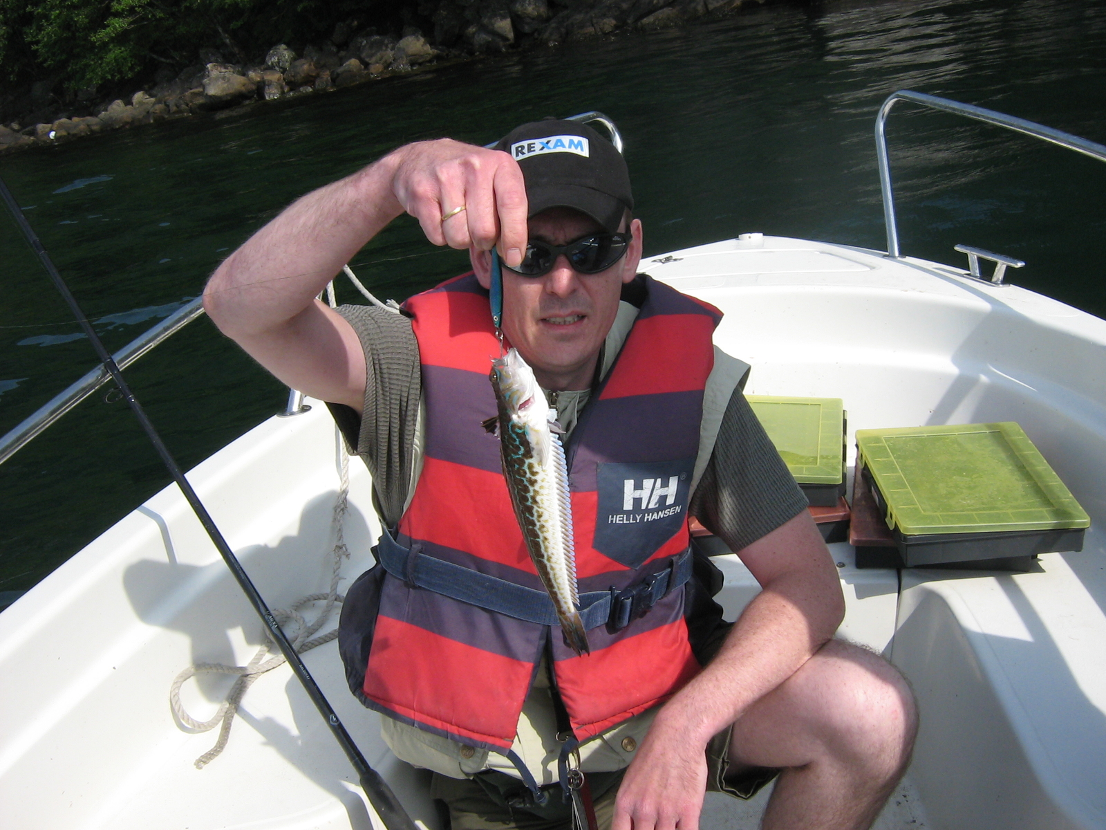 Heute hatte Glenn der vermieter wohl frei.Das Garagentor ratterte nicht und wir konnten bis 9.00 Uhr schlafen.Yipee.der erste Kaffe mit Zigarette auf dem Balkon machte eins Deutlich.Es war betimmt 10 Grad kälter geworden und der Wind frischte auf.Ca.10.30 Uhr gings dann wieder dem Fjord entgegen.Sofort rechts brum Richtung offnes Meer.Auf dem Fjord wehte uns schon ein recht ordentliches Lüftchen entgegen. Etwa mitte Fjord dann Schaumkronen auf den Wellen.Erst mal ab in eine windgeschützte Bucht und Kriegsrat gehalten.Einstimmig waren wir der Meinung das die Wellen,so wie der Wind stand,vorne am Fjordausgang bestimmt noch höher sein werden.Also die Kanten entlang zurück driften lassen.Unglaublich aber wahr,dies brachte bis auf Markrele keine nennenswerten Fänge.Nun ja irgendwann kamen wir wieder an unsere Felsnase.Trotz der nun sehr starken Drift wieder mit 25g Zockern gefischt.Also Zocker runter und nach Grundberührung zügig hochgekurbelt.Etwa zehn Umdrehungen und es riss mir fast die Rute aus der Hand.Jetzt bewährte sich mal wieder die sehr fein justierbare Bremse meiner Shimano.Nach einiger Gegenwehr konnte dann ein Polack von 74cm gelandet werden.Wir ließen uns weiter die Kante entlang richtung Brücke treiben.Dies brachte immer wieder sehr große Markrelen und einen schönen Anschauungsuntericht da auch Fische gefangen wurden die noch nicht alle oder keiner im Boot live gesehen hatte.So gab es Schelfisch,Knurrhan und ein wunderschön gezeichnetes Petermännchen.Die mittlerweile sehr starke Drift trieb uns nun sehr schnell.einige Versuche unter der Brücke brachten wieder Köhler.Gute Küchenfische aber keinen von 2m.Dann bestückte Frank sein Heringspaternoster mit Markrelenfetzen und siehe da,auch Leng steht unter der Brücke.Nennenswert wäre auch noch der Vater aller Heringe den Er dort fing.Solch einen Hering habe ich noch nicht gesehen.Den rest des Tages verbrachten wir am Fjordende.hier war es schön Windgeschützt und obendrein gab es noch Scholle.Die Fischkiste wahr nun fast voll und so beschlossen wir den Heimweg anzutreten.Zwei Mann filetierten wieder und zwei Mann bereiteten das Abendbrot zu. Vor unserer Haustür auf der Terrasse hockten unsere Nachbarn und staunten über unsere Filets.Wie macht Ihr das?Wir fangen nur Markrele.Also die Jungs schnell aufgeklärt und Ungläbigkeit geerntet.Speedpilken?25g Zocker?Ja aber wir angeln schon immer so,mit dicken Pilkern und haben immer Fische gefangen.Na Ihr könnt ja auch so weiter Fischen,zwingt Euch ja keiner.Dann gabs erstmal lecker Makrele frisch gebraten und paaar Bierchen.So das war Tag 3. Tag 4 sollte für uns ein besonderer werden,das schon mal vorweg. -