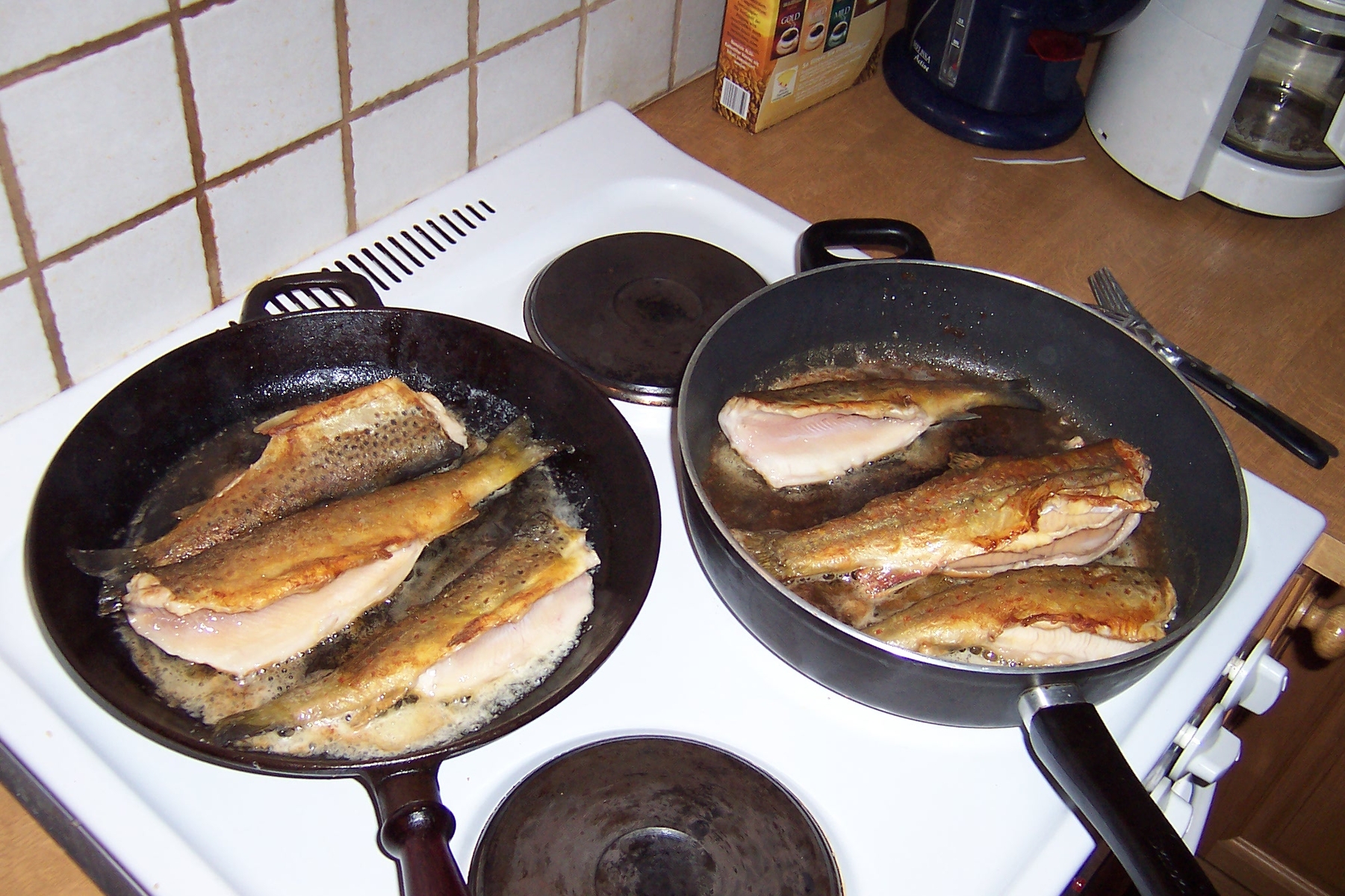 Der Morgen begann mit einem Kaffee auf dem Balkon und der Erkenntnis das es heute wohl keine Ausfahrt geben wird.6 Grad,Regen und Sturmböhen.Die Norweger waren glücklich,hatte es doch seid 9 Wochen im Süden nicht geregnet.Zu entäuscht waren wir aber nicht.Wollten wir der Kvina und den Lachsen sowie so mal auf den Zahn fühlen.Also erst mal gefrühstückt und ab nach Kvinesdal zum X-Sport.Dort trafen wir auf einen super netten Angestellten der auch noch hervorragend Deutsch sprach.Den haben wir dann auch richtig ausgequetscht.Doch Lachsmäßig nahm Er uns erst mal den Wind aus den Segeln.9 Wochen kein Regen,da steigt bei den ersten Schauern noch nichts auf.Vieleicht in ein oder zwei Tagen,aber Ihr könnt es ja versuchen meinte Er.Ok,dann eben auf Bachforelle.Der nette Angestellte war auch hier bestens informiert.Um große Forellen zu fangen müssten wir schon ein Stück oberhalb fischen.Er zeigte uns alles genau auf einer Karte.Ruten,Watstiefel usw. waren schon im Wagen und es konnte sofort losgehen.Es folgte eine ca.60 km lange,stetig hinaufführende Fahrt auf der 465.Es ging durch solch unglaublich schönes Gebiet wie ich es in Südnorwegen weder kannte noch vermutete.Ich/Wir werden noch lange von diesen Eindrücken zehren.Alleine die Kvina änderte ständig ihr Aussehen.Wasserfälle,reißende Stromschnellen,Rieselstrecken und dazwischen immer wieder große nartürlich angestaute Becken.An manchen Stellen fehlte nur noch der Braunbär mit einem Lachs in den Klauen.In Storekvina im Coop dann die Tageskarte gekauft und nicht schlecht gestaunt.30 Kronen für einen ca.50km langen abschnitt.Wow,das nennt man Preisgünstig.Weiter ging die Fahrt bergauf.Unser Ziel war Netland.Doch so weit hielten wir es nicht aus.An einer herlichen Stelle mussten wir einfach anhalten und die Ruten rausholen.Leider machte der hier oben noch viel heftigere Wind ein Fischen mit der Fliegenrute unmöglich.Kleiner Abstieg zur Kvina und schon ging es in einer kaum zu beschreibenden Landschaft los.Thomas fing sofort eine wunderschön gezeichnete Bachforelle von 40cm.Wir trennten uns dann,zwei gingen Flußauf und zwei Flußab.An einem großen gestauten Becken im sumpfigem Uferbereich sahen wir Elchspuren und von (wir vermuten) Bibern gefällte Birken.Einfach nur herlich.Nach ca drei Stunden trafen wir uns am Auto wieder.Frank und ich hatten bis auf ein paar Nachlaufer nichts.Um so größer war die Überraschung das unser Anfänger Ernst einen wunderschönen Saibling überlisten konnte.Nun fuhren wir rauf bis nach Netland.Es wurde ein sehr ertragreiches Fischen.Unzählige Forellen konnten wir keschern.Die größten gar über 40cm.Die Fische waren so herlich gezeichnet und viele von Ihnen so strahlend gelbbäuchig wie wir es nur von dänischen Wiesenbächen kennen.Und so durften auch die meisten von Ihnen ihre Freiheit weiterhin geniesen.Um ca. 20.00 Uhr traten wir dann die Rückfahrt an.Ach ja von den entnommenen Forellen gab es nartürlich 3+1 Saibling in Butter gebraten zum Abendbrot.Die restlichen vier landeten im Räucherofen.