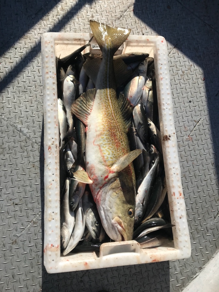 Am Vormittag hatte wieder einmal der alte Fuchs Micha mit seiner Besatzung Ulf, Lars und Ivo das richtige Näschen und machten ihre Kiste mit Dorsch von 74kg voll.