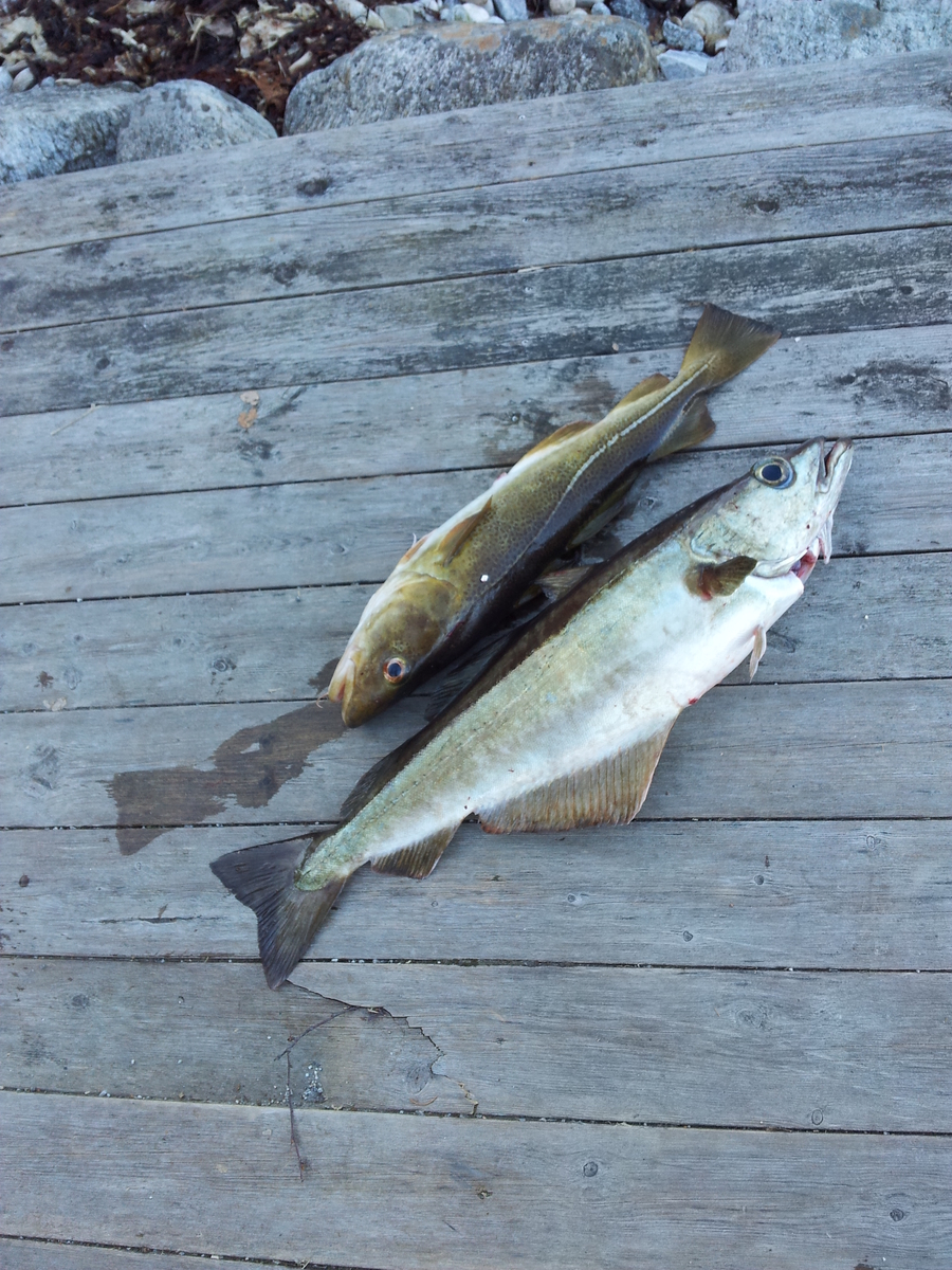 Dort wurden wir auch fündig und konnten außer vielen Seelachsen auch Leng, Dorsch, einen Seeteufel und einen Seehecht erbeuten. Sogar ein kleiner Tintenfisch konnte dem Pilker nicht widerstehen.