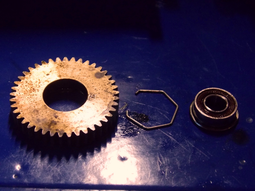 Lager entfernen,Seegerung lösen,dann Zahnrad abnehmen.....(Lagermaß 4x11x4mm ZZ)