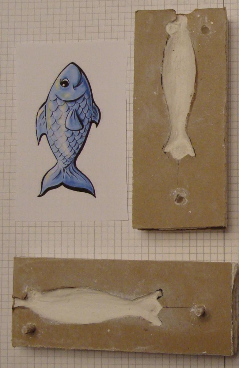Angefangen habe ich wie so viele mit den Pilkern. Bleigussformen kenne ich aber bei meinem aktuellen Bedarf wären die genauso teuer wie gekaufte Pilker. Mein erster Versuch mit Gipsspachtel eine Form gießen war nichts, die Formen hatten immer zu viel Restfeuchte und der Guss war miserabel. Waren die Formen endlich trocken genug, sind sie zerbrochen. Nachdem ich recht gute Ergebnisse mit Bleiguss in angebohrten Holzformen erzielt hab bin ich für die Fischform auf Gipskarton (Trockenbau) gekommen. Plattenreste bekam ich kostenlos besonders die festen z.B. Diamant gingen gut, nur muss man halt die Form da erstmal reinschnitzen. Also Schablone ausgedruckt, aufgemalt und los.