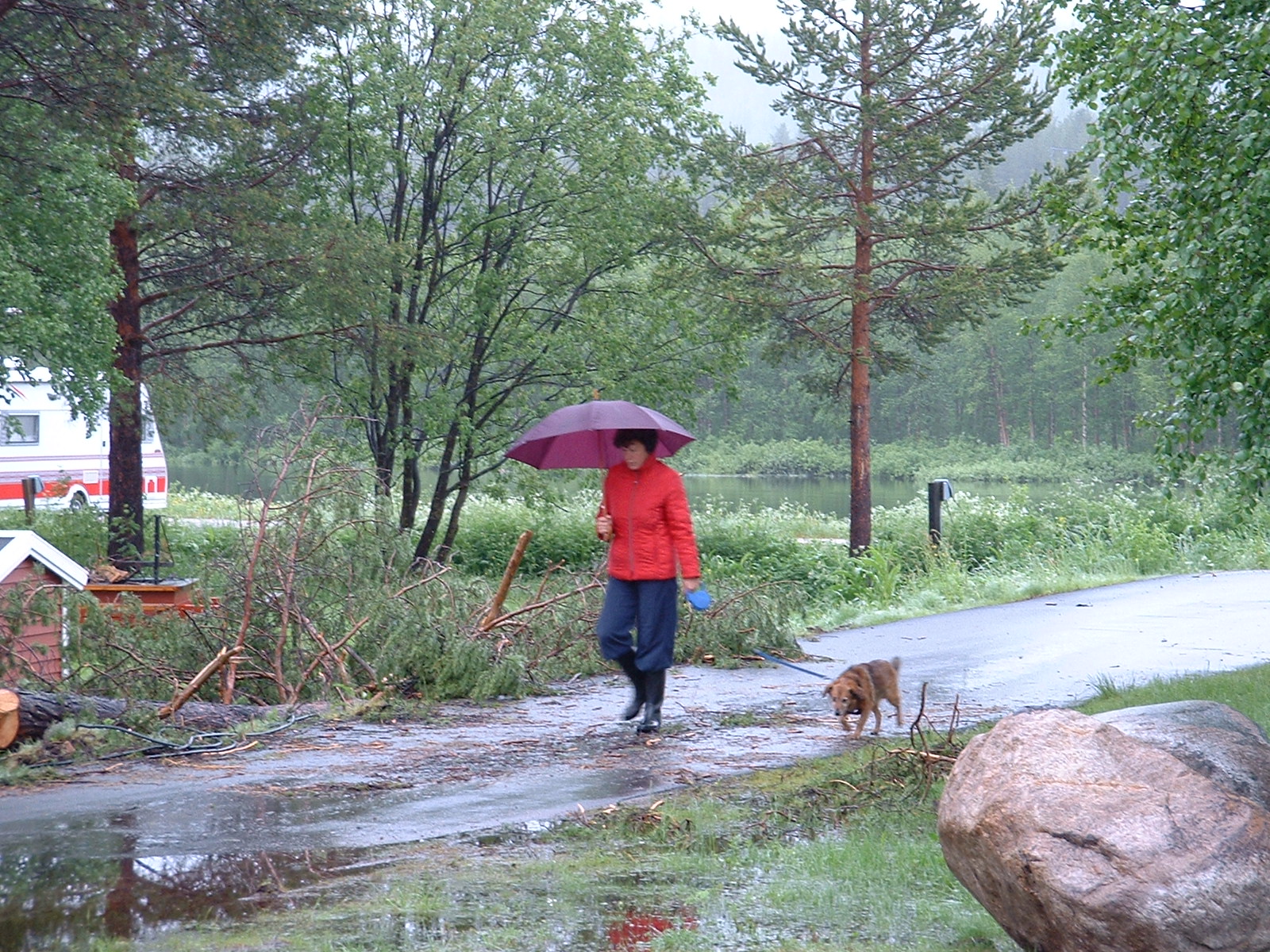 Na ja ,Dann will ich mal weitermachen.Am zweiten Morgen in Arjeplog aufgewacht und was soll ich euch sagen ,es regnet. Egal ,wir haben ja ....richtig Urlaub .Nach dem ich beim Auto beladen schon einmal völlig durchnässt war ,zog ich erst mal trockene Sachen an und auf gings nochmal nach Arjeplog.Das Silbermuseum hatten wir noch nicht gesehen.Jerry war froh,dass er nicht mit ins Museum durfte ,denn er musste nicht durch den Regen laufen .Das Museum sollte man sich unbedingt anschauen ,da gibt es Silberschmuck aus mehreren Jahrhunderten Samenkultur zu sehen .Wirklich sehr interesant.Aber nun schnell weiter nach Arvidsjaur.Dort angekommen besuchten wir die Lappstad.Das ist ein bis in die heutige Zeit genutzter Treffpunkt der Sami zu Hochzeiten und ähnlicher Festlichkeiten .Hier kann man an einigen Informationstafeln einiges über die Samikultur erfahren.Das war für uns sehr interesant.Ausser für unseren Jerry ,denn der konnte nicht lesen und musste auch noch ,richtig ,im Regen rumlaufen .Schade das Hunde nicht wirklich Wasserdicht sind.Nach der Besichtigung fuhren wir weiter nach Jokkmok.Wenige Kilometer vor Jokkmok überquert man den Polarkreis.Um genau 13.03 Uhr war es dann für uns soweit.Bei 8 Grad Celsius und natürlich ,richtig,Dauerregen überquerten wir den Polarkreis .Begeisternd war es nicht ,warum wohl ,shit Wetter.Aber Foto gab es trotzdem ,mit langen Gesichtern.(seht ihr noch).In Jokkmok selbst haben wir erst mal ein Lokal aufgesucht und ein deftiges Mittagsmahl zu uns genommen.Es gab Rentiergeschnetzeltes mit Preiselbeeren und Kartoffelbrei.Tolle Kombination ,aber schmeckt recht gut.In Jokkmok erkundeten wir zunächst die Stadt und konnten ein wunderschönes Museum über die Samikultur finden,deshalb waren wir ja hier .Trotz Regen.Dort wird in beeindruckender Weise die Labensart der Sami dargestellt .Besonders gefallen hat uns ,wie schön die nordische Natur in diesem Museum den Besuchern nahegebracht wird.Da gab es Lemminge,Elche ,Bären ,Luchse ,Wölfe und Rentiere ebenso wie die Vogelwelt über Eistaucher ,Gänsesäger und Singschwäne.Besonders interesant ,für mich, war die Ausstellung über die heimische Fischwelt.Auch die Kirche in Jokkmok war einen kurzen Besuch wert.Dann aber weiter ,wir wollten den Regen hinter uns lassen.Ziel war Gällivare ,das erreichten wir recht schnell ,aber den Regen konnten wir nicht abhängen.Was solls wir haben ja Urlaub.Auf dem dortigen Zeltplatz angekommen mieteten wir uns eine Hütte mit TV,denn heute war Halbfinale Deutschland -Türkei.Bis dahin war noch Zeit und ich wollte fürs Abendbrot sorgen.Der Fluss verlief neben der Hütte also Spinnrute geschnappt und los. Erster Wurf ,Kontakt und wie ,ein recht guter Hecht verabschiedet sich dann aber recht schnell .Was solls Dauerregen und Urlaub ,ich wusste im Moment nichts schöneres.Ein paar Barsche haben ja dann doch noch den Weg in die Pfanne gefunden und die schmeckten richtig gut .Im Fussball lief dann mit grosser Spannung auch noch alles prächtig und so merkte ich ihn bei der Siegeszigarre gar nicht mehr,den Dauerregen.Am nächsten Tag aus dem Fenster geschaut und was macht es ,regnen .Wir weiter nach Kiruna ,Besichtigung der Mine war angesagt .Am Touristenbüro angelangt erfuhren wir das nur noch ein Platz im Bus frei war ,und da wir zusammen wollten verzichteten wir .Die nächste Exkursion fand erst am nächsten Tag statt. Wir ergänzten noch unsere Vorräte in Kiruna und fuhren dann in Richtung Kolari ,Finnland.In der Hoffnung es würde aufhören zu Regnen.Aber das tat es nicht .Was solls wir haben ....die Schnauze voll ,bis oben hin.Der Regen legte sich allmählich aufs Stimmungsbild ,es wurde allerhöchste Zeit für einen Wetterwechsel.In Finnland angelangt fuhren wir weiter in Richtung Rovaniemi.Inzwischen war es schon später Nachmittag und ausgelaugt vom Fahren und vom Dauerregen ,beschlossen wir Quartier zu machen.Da kam auch schon der Hinweis auf ein Ferienhaus,rechts fahren und 22km.Wir taten es .An besagter Stelle angekommen begrüssten uns vier riesige Russen die sich schon dort eingemietet hatten.Nie so grosse Menschen gesehen ,ob die wohl gewachsen waren ,im Dauerregen .Also 22km zurück ,vergass ich zu erwähnen ,über Schotterpiste.Der Verso war nicht wiederzuerkennen,er hatte die Farbe der Schotterpiste angenommen ,war der nicht mal Blau? Was solls wir haben ja Urlaub und ansonsten ist alles ,ausser dem Regen ,fast in Ordnung.Schlieslich haben wir doch noch ein wunderschönes Blockhaus am Ufer eines grossen Flusses gefunden ,endlich und Gott sei Dank.Aber darüber möcht ich morgen berichten.