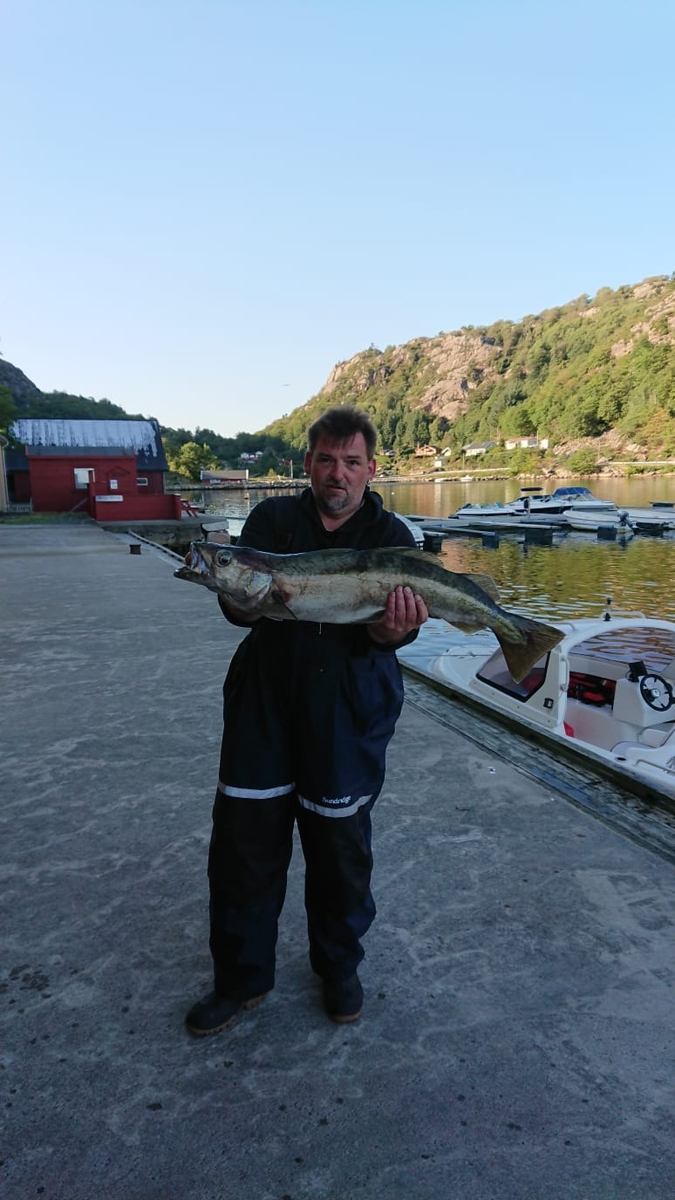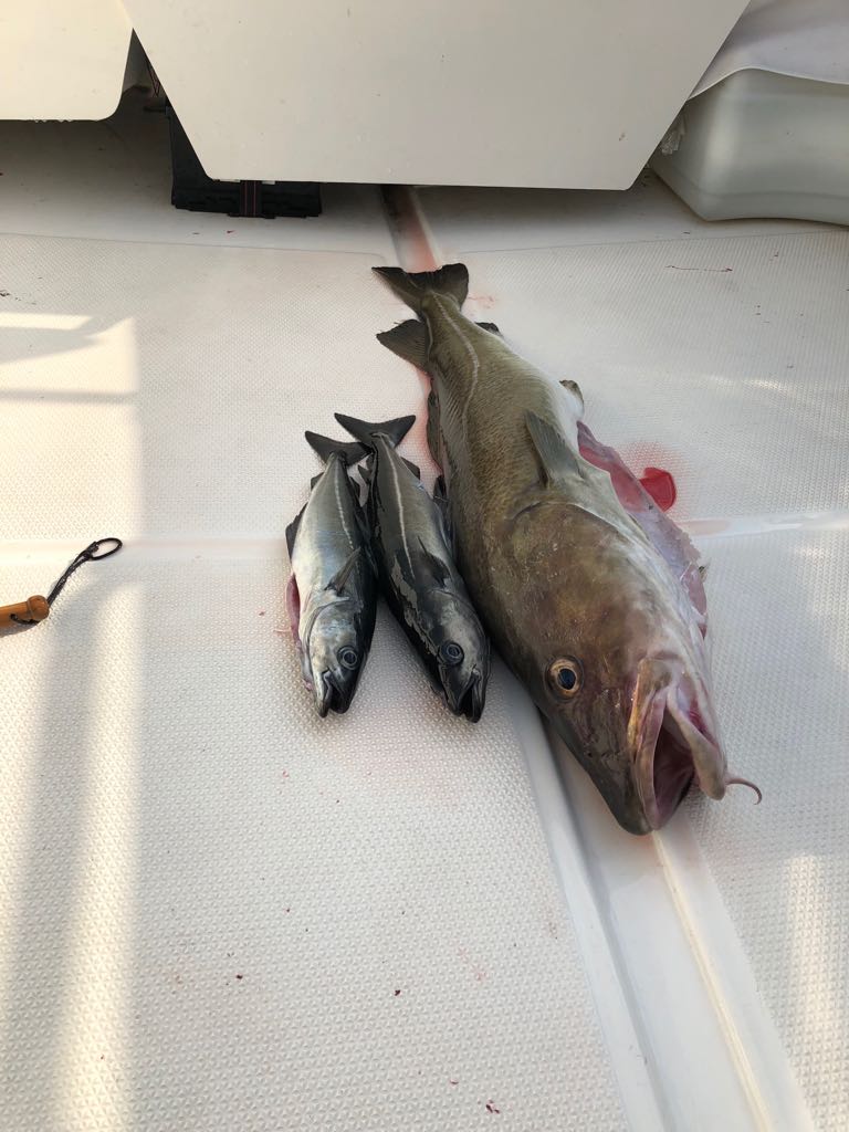 Wir fingen Schellfische bis 2 kg, Pollack bis 2,5 kg, Dorsch 2,5 kg, Makrelen leider wenige, Wittlinge erstaunlicherweise nur kleine, Küchenleng 60-70 cm und den Kameraden hier