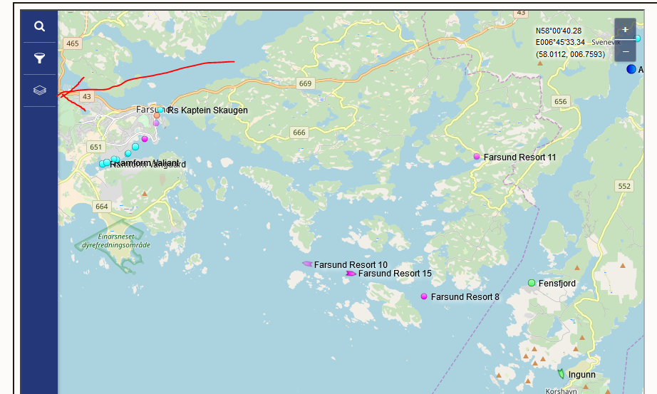 Schiebe die Karte mal so, dass du westlich von Lindesnes bist. Dann siehst du evtl. auch die Bootsbezeichnung "Farsund Resort".