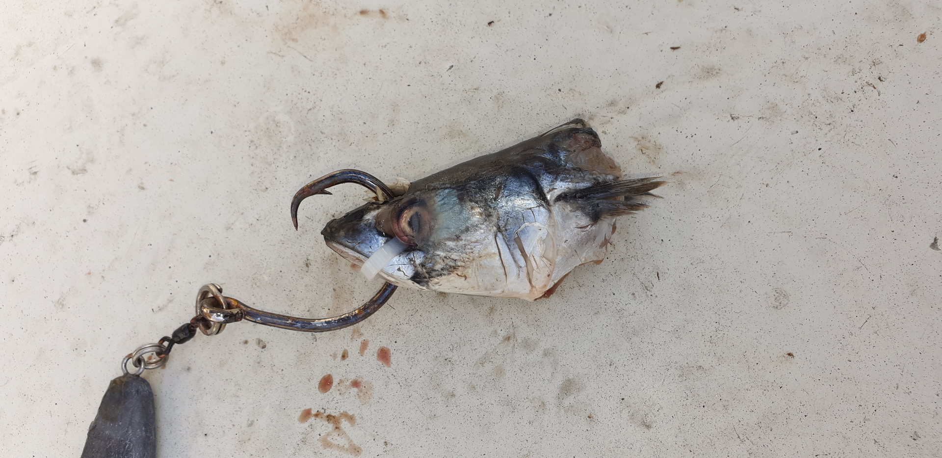 Wie du ja weißt, angeln wir mit Circle-Hooks und Fetzen, die 2 X 8 cm groß sind. Mit Makrelenkopf werde ich es auch einmal probieren.