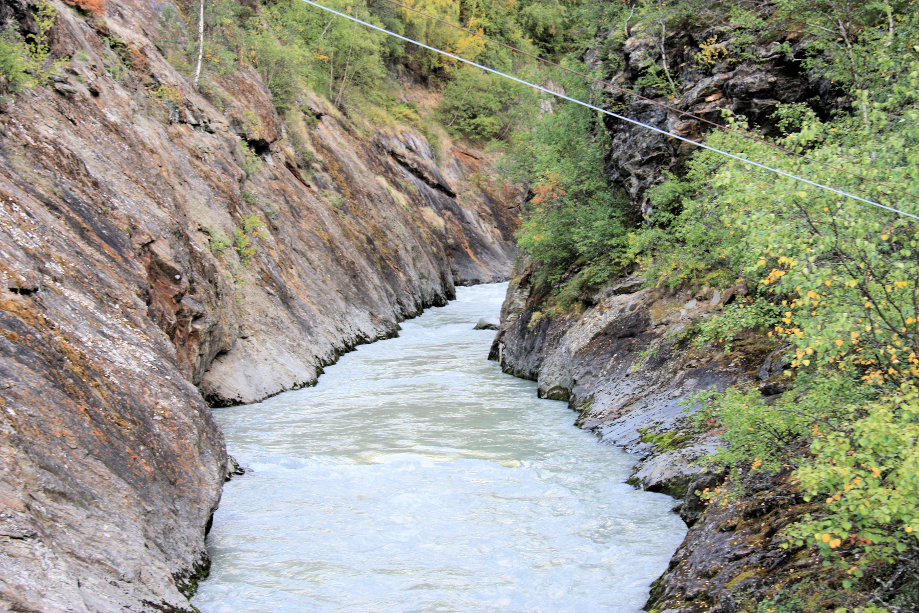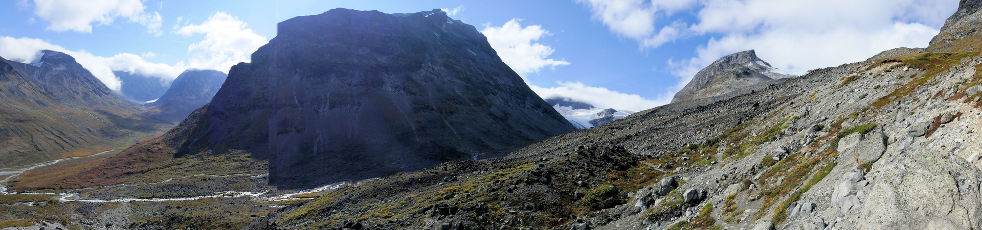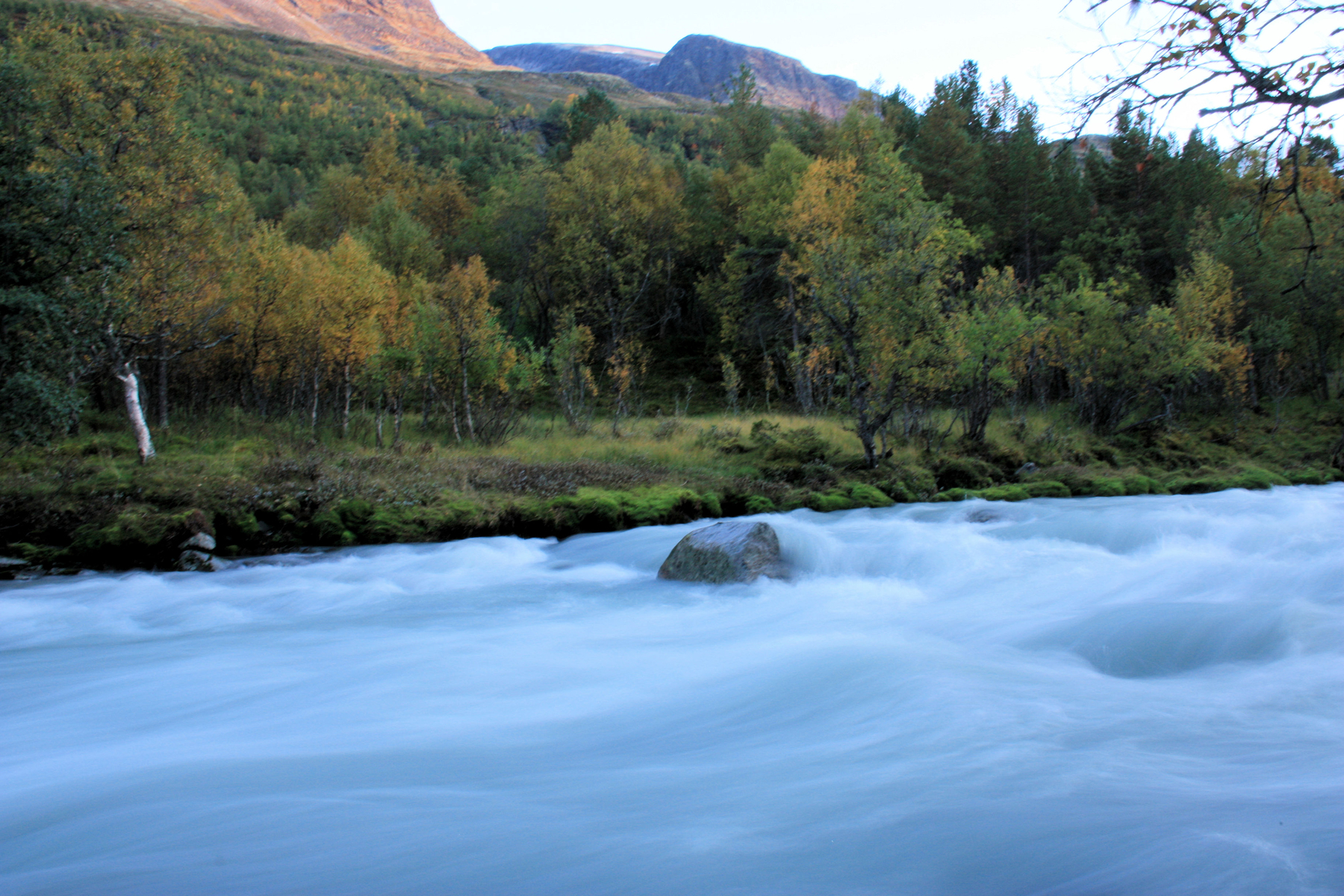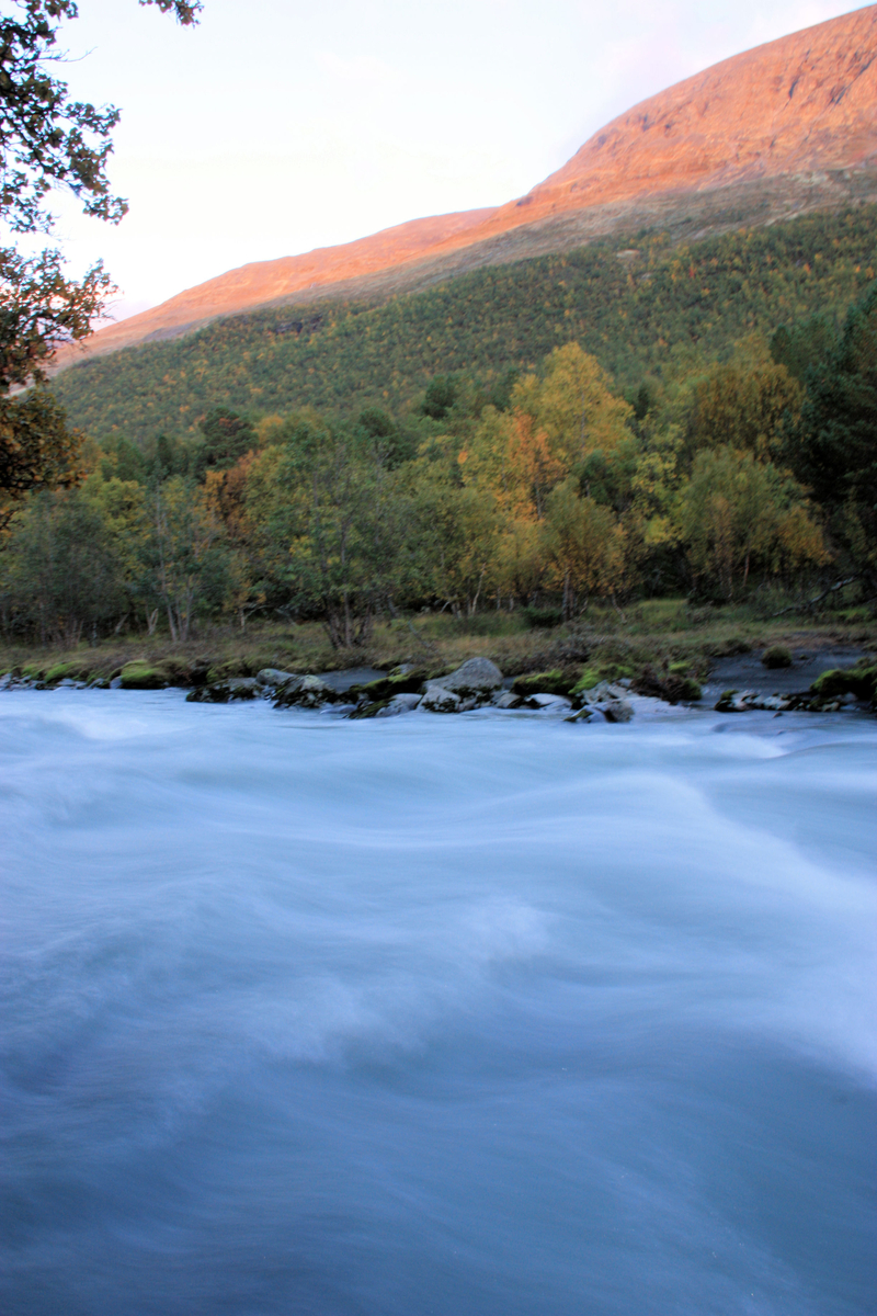 ...beim Anblick ahnte man etwas...wie flüssiger Beton....erinnert euch einmal des milchig - türkis Farbenden Wassers, wir waren am Ursprung. Es handelt sich um Gletscherwasser, das hier unendliche Sedimente und Schwebstoffe mitnimmt - die diese Färbung bis weit in die Flüsse des Gudbrandalen tragen.... Später konnten wir an Hand der Färbung von Flüssen recht sicher sein "herkommen" bestimmen - nur vom Fjel oder von einem Gletschergebiet.....