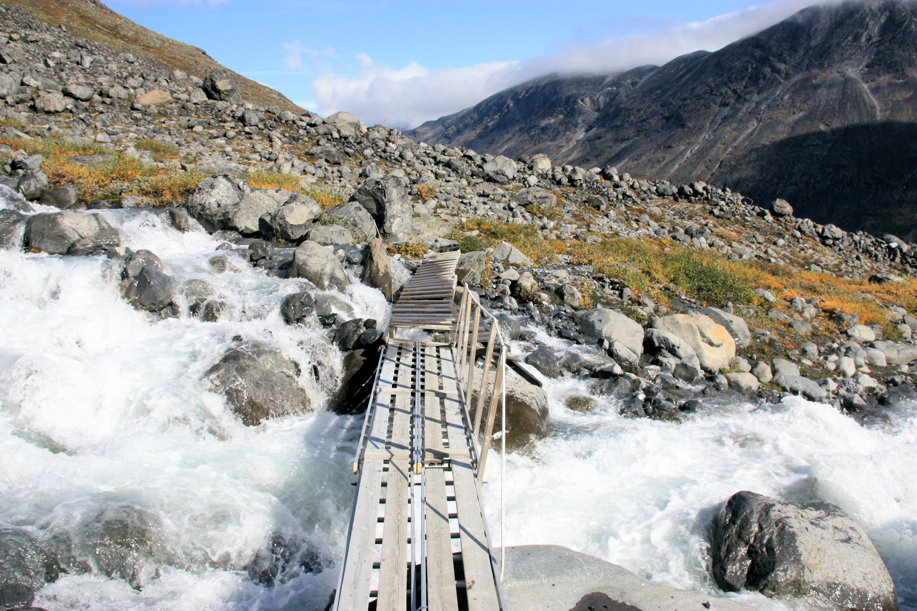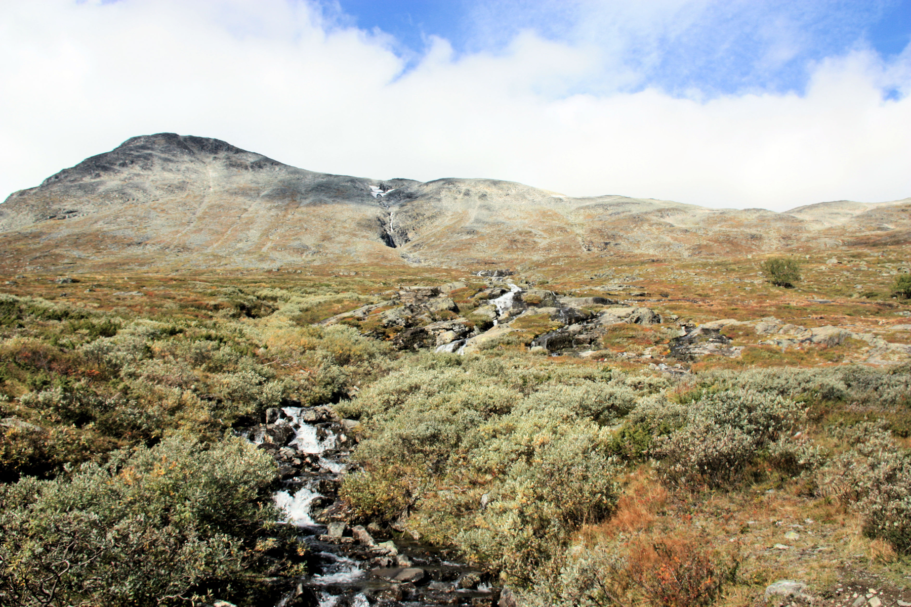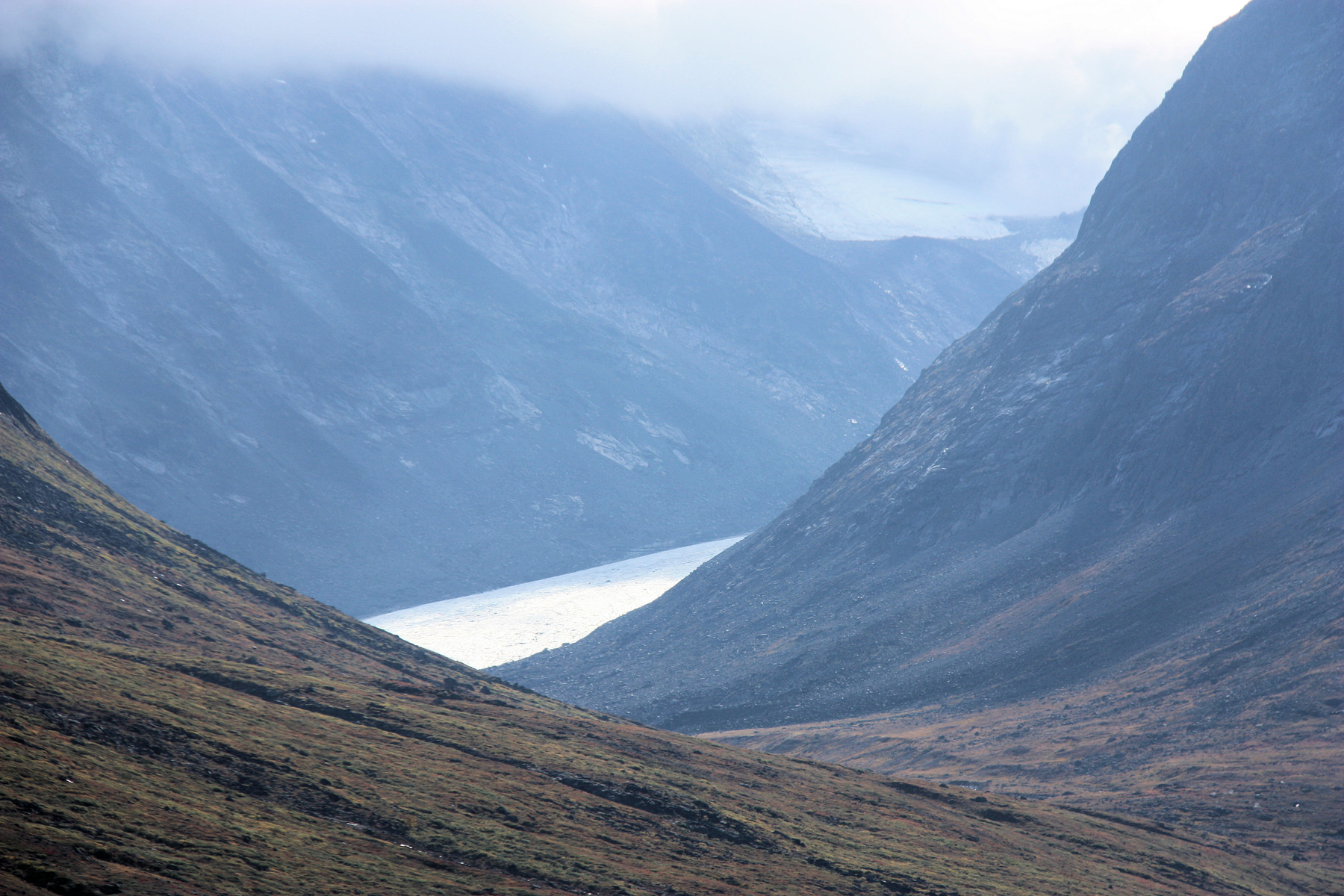 ...beim Anblick ahnte man etwas...wie flüssiger Beton....erinnert euch einmal des milchig - türkis Farbenden Wassers, wir waren am Ursprung. Es handelt sich um Gletscherwasser, das hier unendliche Sedimente und Schwebstoffe mitnimmt - die diese Färbung bis weit in die Flüsse des Gudbrandalen tragen.... Später konnten wir an Hand der Färbung von Flüssen recht sicher sein "herkommen" bestimmen - nur vom Fjel oder von einem Gletschergebiet.....