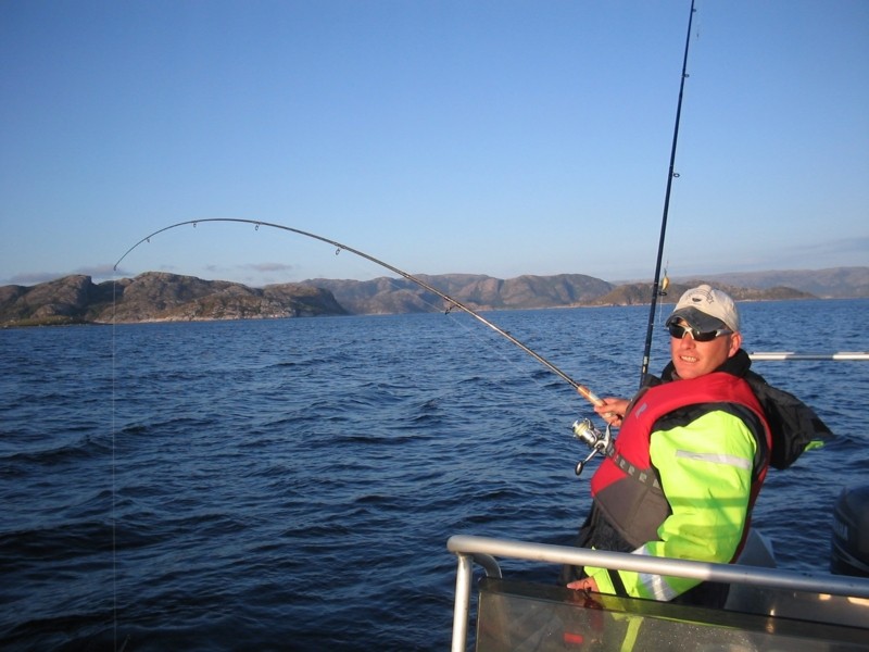 Gegen 11.00 Uhr starteten wir unsere erste gemeinsame Ausfahrt. Den ganzen Tag über suchten wir die Kanten und Berge vor unserer „Haustür“ und den kleinen vorgelagerten Inseln ab. Leichte Pilkruten kamen zum Einsatz, allerdings mit nur mäßigem Erfolg, denn kleine Köhler um die 30cm stiegen immer wieder ein (natürlich durften Alle wieder schwimmen). Kam man mal durch den Köhlerschwarm zum Grund, schnappte sich meist ein Küchendorsch um die 60cm den 150g Pilker. Auch ein kleiner Leng verirrte sich an meinen Pilker und wurde mit den Worten: „schick deine Eltern vorbei“ wieder in sein nasses Element entlassen. Die Sonne brannte mittlerweile vom Himmel und so beschlossen wir unsere Methode zu ändern. Jetzt kamen leichte Spinnruten (bis 80g Wurfgewicht) und kleine schlanke Mefo-Pilker bis 70g zum Einsatz. Gleich die erste Drift an einer Strömungskante direkt an der Rückseite von Hemnskjel brachte bei Matze einen schönen Pollack von über 90cm. Wir hatten eine Hot-Spot gefunden wo die Pollacks Kleinfische aus der Strömung jagten (nachfolgend nur noch „Pollack-Kante“ genannt!). Nach einigen Driften hatten wir gute Pollacks und Dorsche im Boot. Gegen späten Nachmittag versuchten wir es dann mit Naturköder, was aber keinen Erfolg brachte. Abends gab es dann Pollack in Bierteich (nach dem Rezept von Rainer Korn, lecker) und einen kleinen Schnaps als Tagesabschluss. Die ersten Filets wanderten auch in die Truhe.