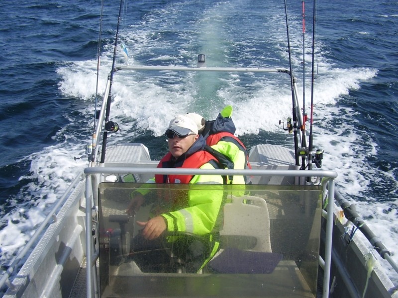 Regen und mäßiger Wind begleiten uns den ganzen Tag! Wir bleiben unserm Matze zuliebe zunächst im etwas geschützten Bereich, fangen aber nicht viel. Gegen Mittag beruhigt sich das Wetter und wir können wieder an unsere Pollack-Kante! Zunächst haben wir Null-Drift, daher versuchen wir es noch einmal an einer nahe gelegenen Kante, aber außer Kleinköhlern ist nichts zu machen. Wir steuern um die kleinen Inseln und versuchen Strömungskanten zu finden, ab und zu kommt ein Küchendorsch ins Boot. Der Gezeitenwechsel ist jetzt knapp 2 Stunden her und an unserem Hot-Spot ist wieder Strömung. Und mit der Strömung kommen die Pollacks und…große Köhler!!! Endlich, zwei von ihnen können wir verhaften. Mein Bruder schrammt mit 96cm knapp an der Metermarke vorbei, in etwa 8kg bringt der Jäger auf die Waage. Mein Fisch hat 85cm und biss beim schnellen Einkurbeln. Wir vermuten, es muss am Wind gelegen haben! Nach zwei Tagen Westwind kommen jetzt die ersten guten Köhler. Zudem können wir noch drei gute Pollacks verhaften. Danach ist aber Schluss, denn das Wetter lässt weiteres Angeln nicht mehr zu.