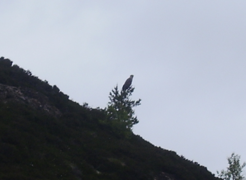 Sprühregen und Wind, trotzdem können wir noch einmal zu unserem Hot-Spot. Matze fängt sogleich einen starken Pollack von 94cm! Ich beschränke mich aufs filmen, denn mein schöner fängiger Mefo-Pilker hat sich gleich bei der ersten Drift die Unterwasserkante einverleibt. Auf einen anderen blau-silbernen Pilker fange ich daraufhin meine dritte Seegurke in diesem Urlaub, was die beiden Anderen mit einigen Sprüchen quittieren. Also drehe ich den Rest von meinem zweiten Film ab und schaue zu. Ich kann zwar später noch einen guten Pollack um die 85cm fangen, aber mein Glückstag ist dieser letzte Tag nicht. Trotzdem bekommen wir zum Abschluss noch einmal unseren Maurerkübel im Boot mit Fisch voll. Wir fahren nun zeitig zurück, denn wir müssen noch Sachen packen. Am Abend gibt es noch einmal Fisch satt in der Pfanne. Ein schöner Abschluss am Abend bietet sich Matze und mir, nachdem wir die Fischabfälle auf den Fjord rausfahren, verfolgt von den Möwen, verlässt auch ein Adler seinen Felsen und schnappt sich 20m hinter unserm Boot seinen Anteil vom filetierten Pollack.